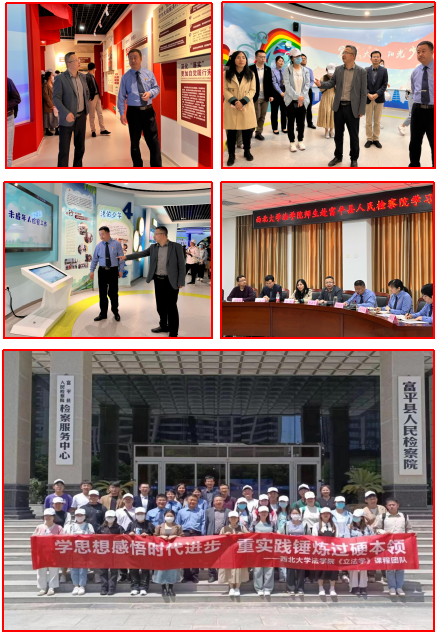 2023年5月12日上午,团队一行前往富平县人民检察院参观学习。在检察院党组成员、第四检察部李长军主任的带领下,参观了富平县检察院12309检察服务中心、检察公益诉讼指挥中心、红色检察文化教育培训宣传室、青少年法治教育基地等,近距离了解检察职能,感受检察文化。随后,团队成员与检察官进行了座谈交流,双方围绕检察公益诉讼、未成年人保护等工作及司法体制改革后检察机关如何更好履行法律监督职能等方面进行了交流,深入了解了检察机关的工作职责及案件审查等方面的工作流程,让参加研学的师生对检察机关的工作状况有了全面的把握。