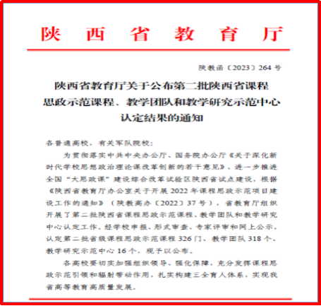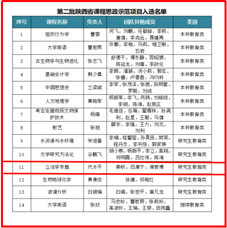 近日,陕西省教育厅公布第二批陕西省课程思政示范课程、教学团队结果,我院代水平副教授负责的立法学专题》入选省级课程思政示范课程和教学团队。