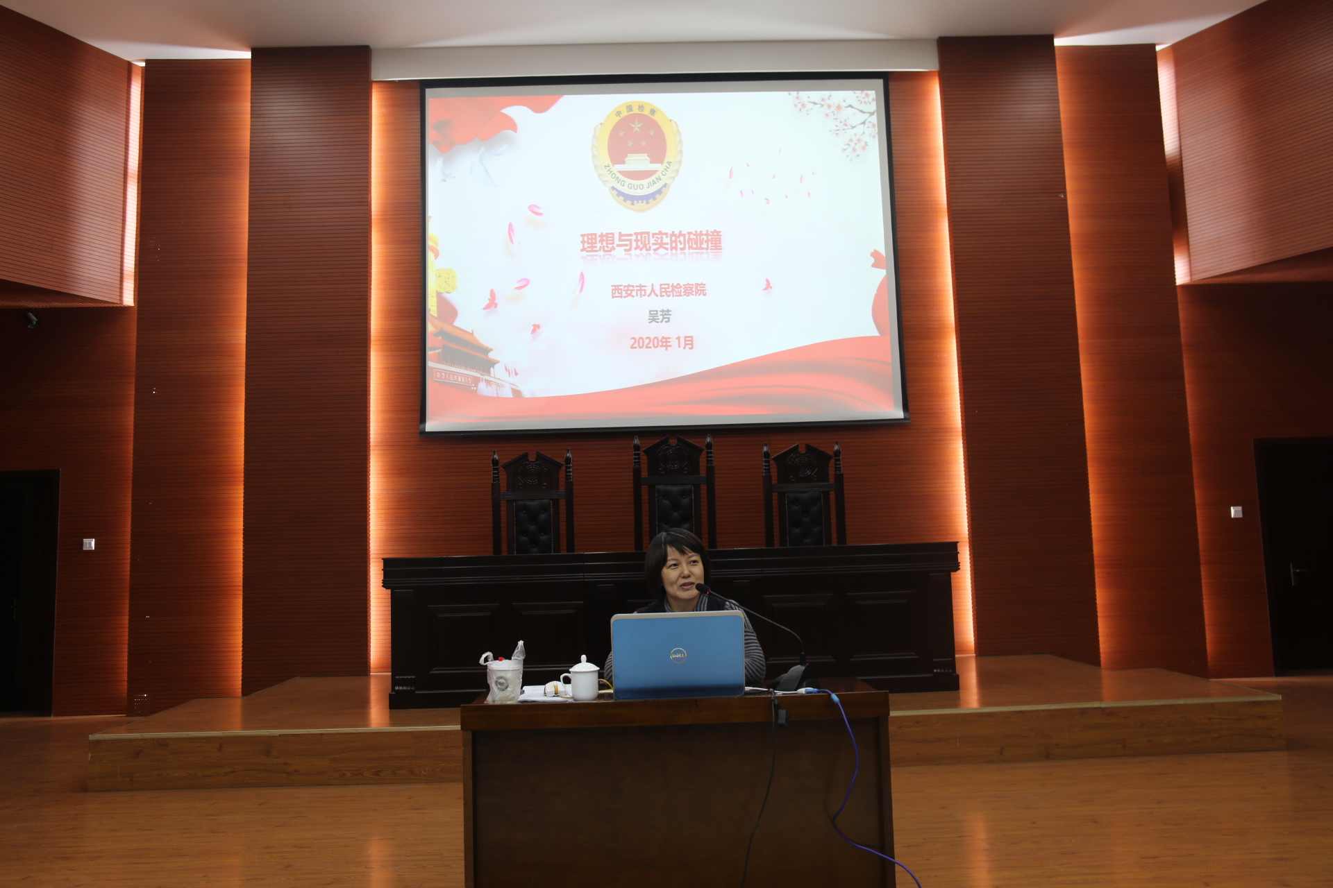 2020年1月7日14时30分,西安市人民检察院检察官吴芳在我院模拟法庭举行了一场题为“理想与现实的碰撞”的讲座。讲座由王思锋院长主持,莅临讲座的嘉宾还有18级班主任涂慧老师,辅导员吴怡、张邓斓,以及242net必赢2018、2019级全体本科生。