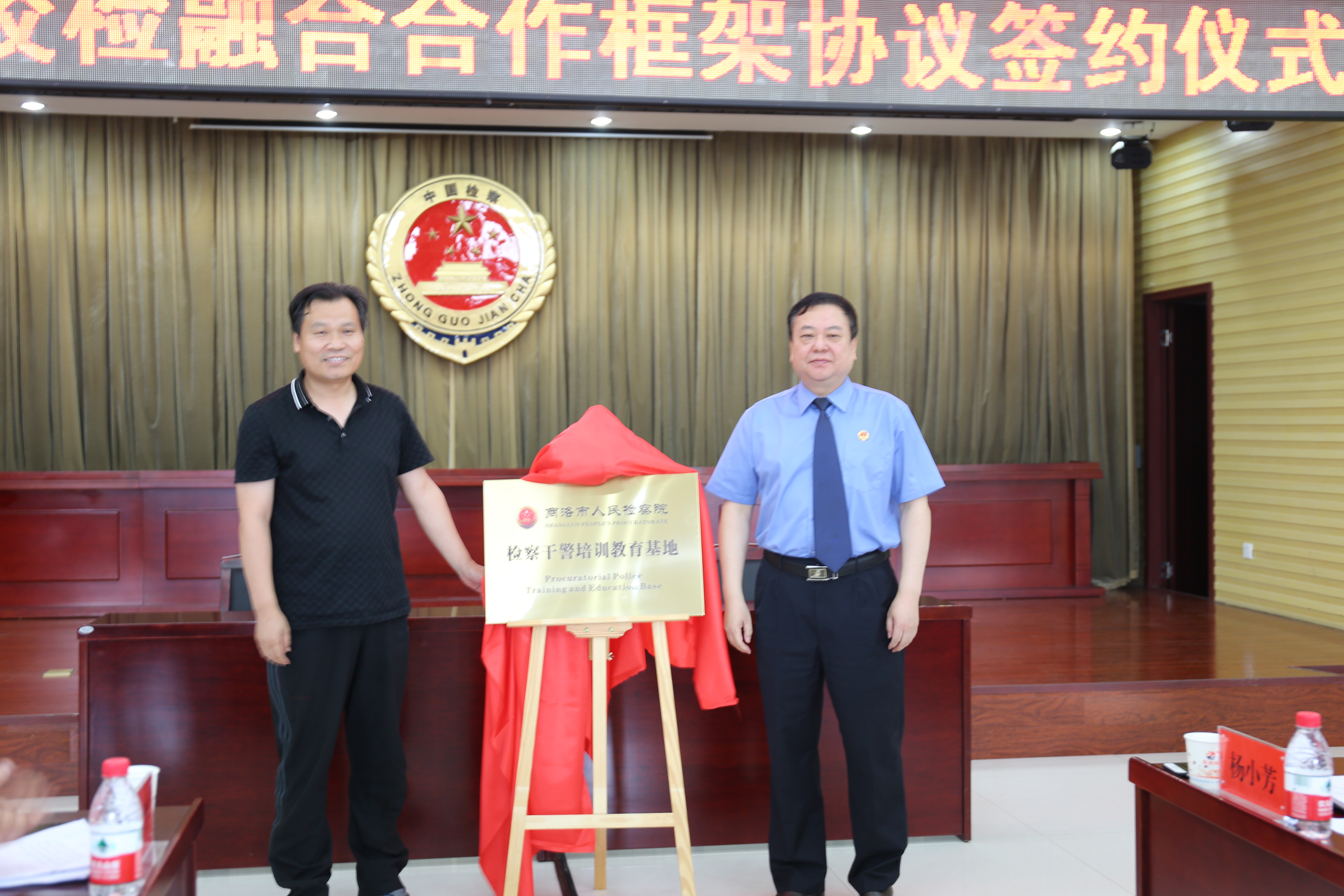 随后,我院王思锋院长与刘向东检察长签署全面合作协议,互相颁发聘书,并举行“242net必赢太阳能卓越法治人才实践教学基地”、“商洛市人民检察院检察干警培训教育基地”揭牌仪式。