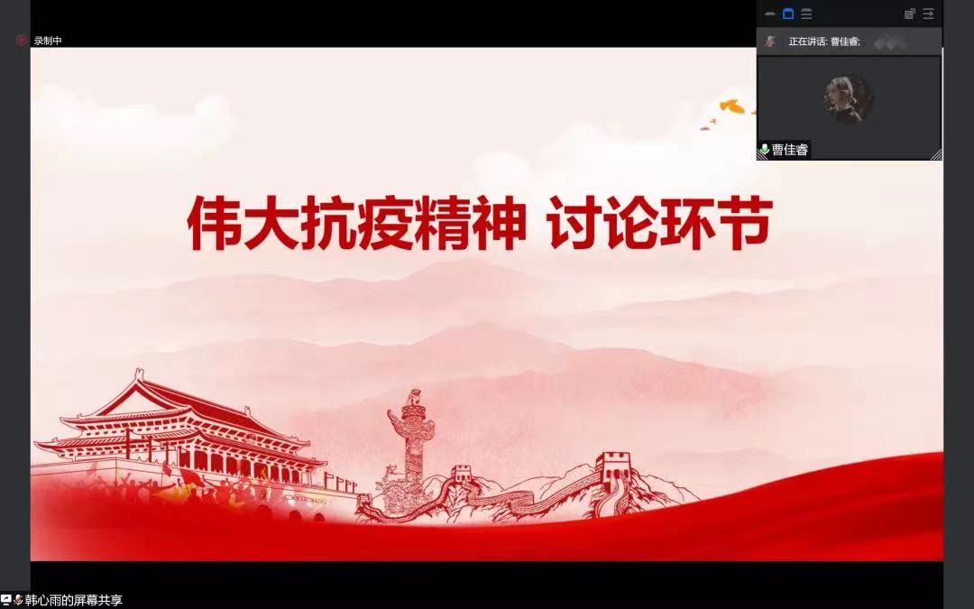 吴若逸、陈瑜、曹佳睿、燕江涛等多位同学结合自己身边的抗疫事迹对伟大抗疫精神进行了讨论。同学们表示,在现在这个特殊的时期,正因为有医护人员、志愿者、老师、后勤人员的默默付出,才有了我们在校园里的平静有序的生活,感谢每一个在疫情中无私奉献的工作人员和志愿者,愿每一个西大人携起手来,共同度过这一大考。