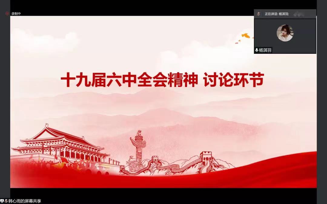 蒲婷睿、杨淇羽、李紫薇、张金荣等多为同学对于十九届六中全会精神交流了学习体会。同学们表示,作为新时代青年,我们要从百年党史中汲取奋进力量,要勇于担当、积极作为,肩负起时代赋予我们的历史重任,让青春在为祖国、为人民、为民族、为人类的奉献中焕发出更加绚丽的光彩。