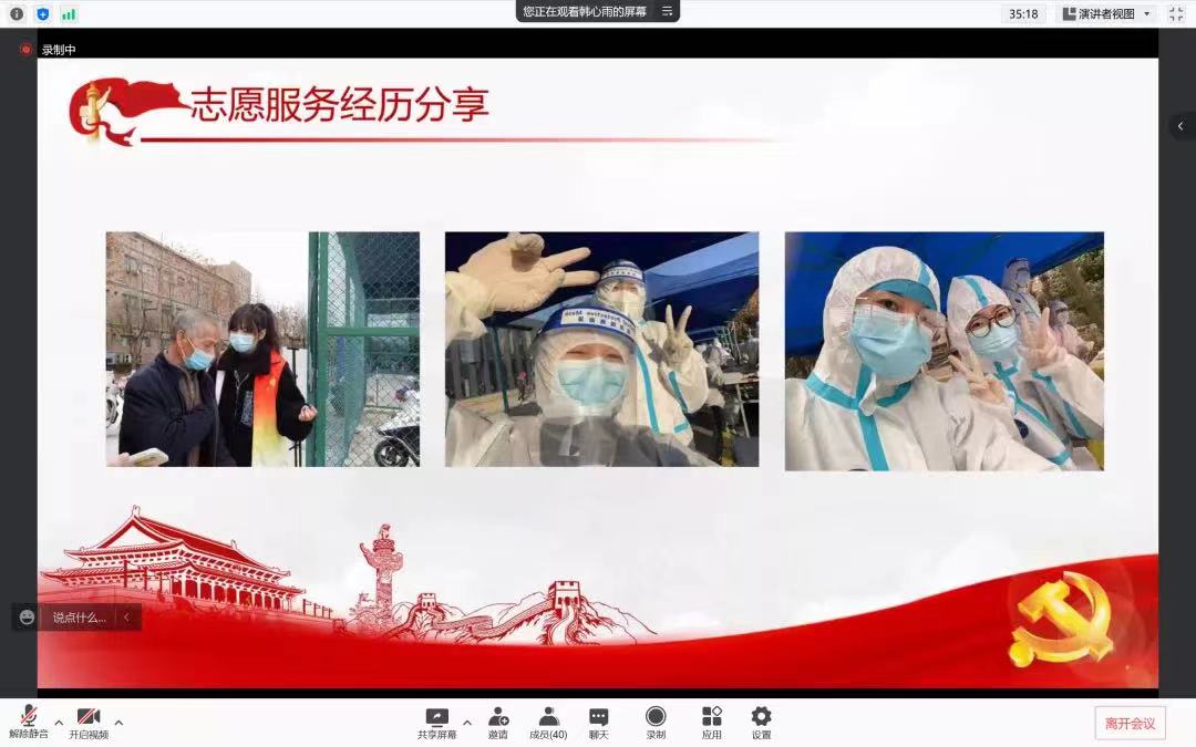 韩心雨同学主要从学校在防疫工作布置上的努力、自己的志愿服务经历等方面进行了分享,她表示,志愿者工作虽然辛苦,但是时刻传递着温暖和感动。在这样的非常时期,很荣幸自己能够在自己力所能及的范围内为学校的防疫工作出一份力。希望青马学员们做好自身防护,做好带头作用,以实际行动践行“请党放心,强国有我”的青春誓言,发扬斗争精神,科学参与防控,汇聚起战胜疫情的磅礴力量!