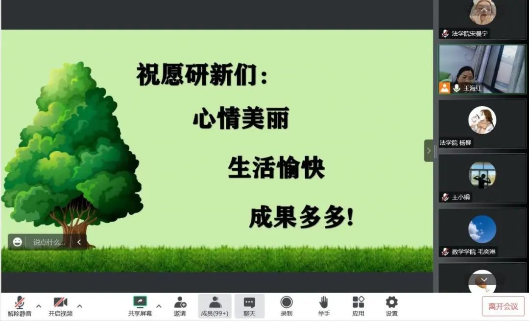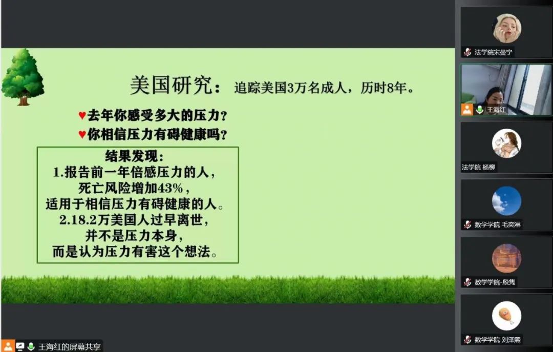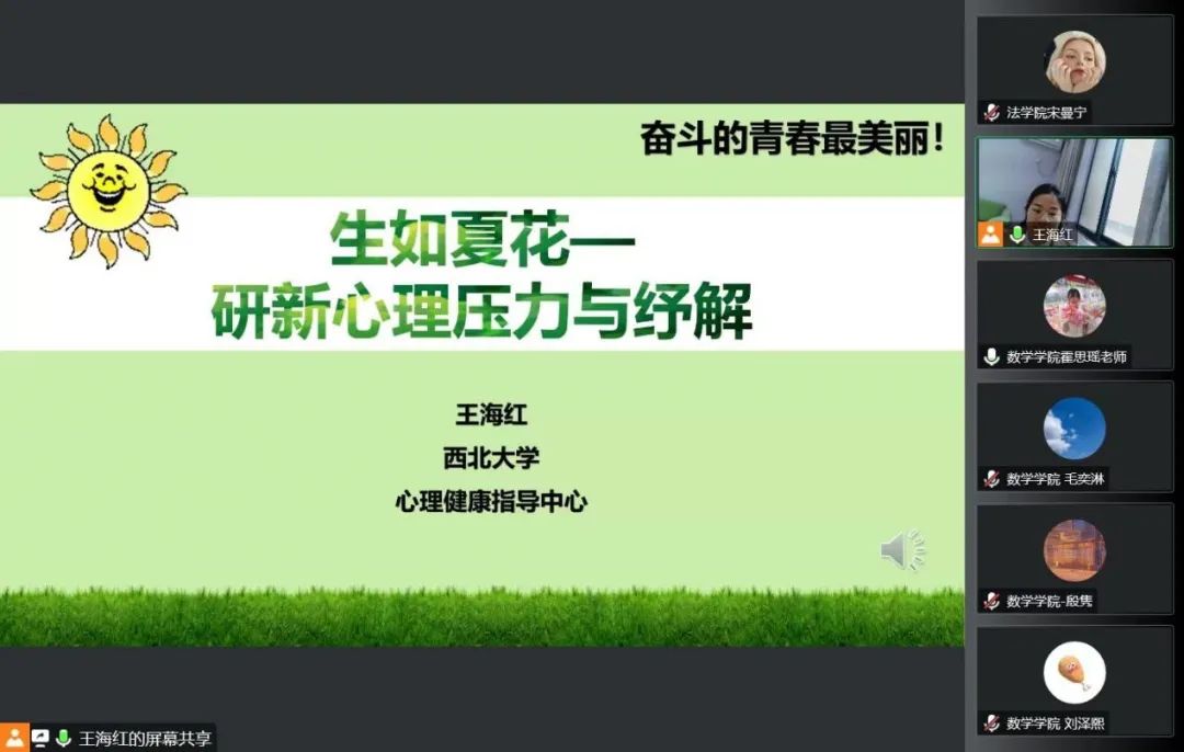10月12日下午16时,在校心理健康教育中心的统一安排下,我院与数学学院合办,顺利开展研究生新生心理线上讲座。本次讲座主题为“生如夏花--研新心理压力与纾解”,由我校心理中心王海红老师主讲,数学学院与242net必赢260余名学生参加。