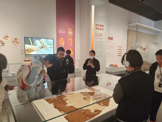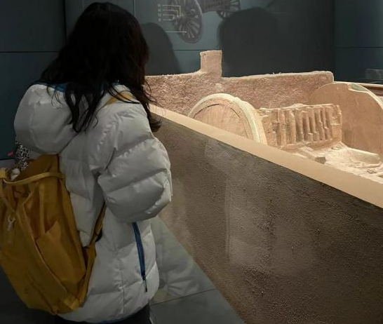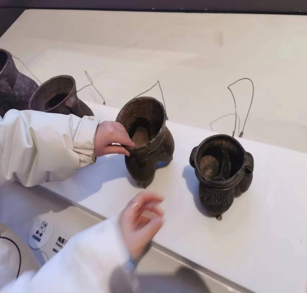在讲解员的带领下,实践团队伍首先迈进了第一展厅——“考古历程”,从远古时期的钻木取火到文字文明的诞生,从奴隶制国家向封建社会的演变,从寻常百姓到皇室贵胄,从太平盛世到战火纷飞,从文武百官到国祚绵长。这里有大汉光耀千古的“文景之治”,有盛唐万国来朝的国富民丰,有宋制文运昌盛的清丽词作,也有元明清的百家故事与文物瑰宝。实践团跟随着讲解员的步伐,在这座长安古城的“灵魂客厅”里,倾听陈列品无声地讲述每段历史的变迁与文化记忆,其中亲手触摸文物的环节令同学们感受最深刻,现场同学说道:“亲手触摸到文物碎片的那一刻真的有种穿越时空和古代先贤对话的感觉,铜器上面的纹路虽然已经饱受岁月的侵蚀,但当体温与那段历史的余温重合的时候,那一刻我真的很骄傲自己是炎黄子孙。