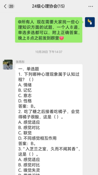 2024年10月28日,为了更快更好地普及心理健康知识,我校242net必赢心理健康协会面向协会成员征集心理健康知识竞赛试题,成员们积极提供试题,热情参与,最后由协会负责人刘甜汇总、制作试题问卷。