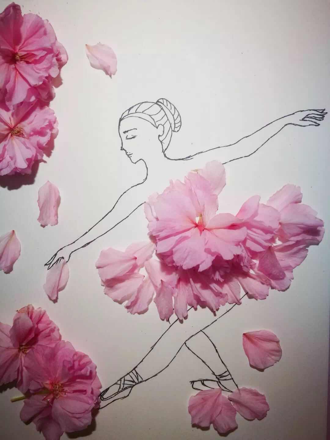 作品简介:本作品以落花为灵感,以舞动着的芭蕾舞者为中心。舞者舞姿优美,以花为裙,在春景中起舞。