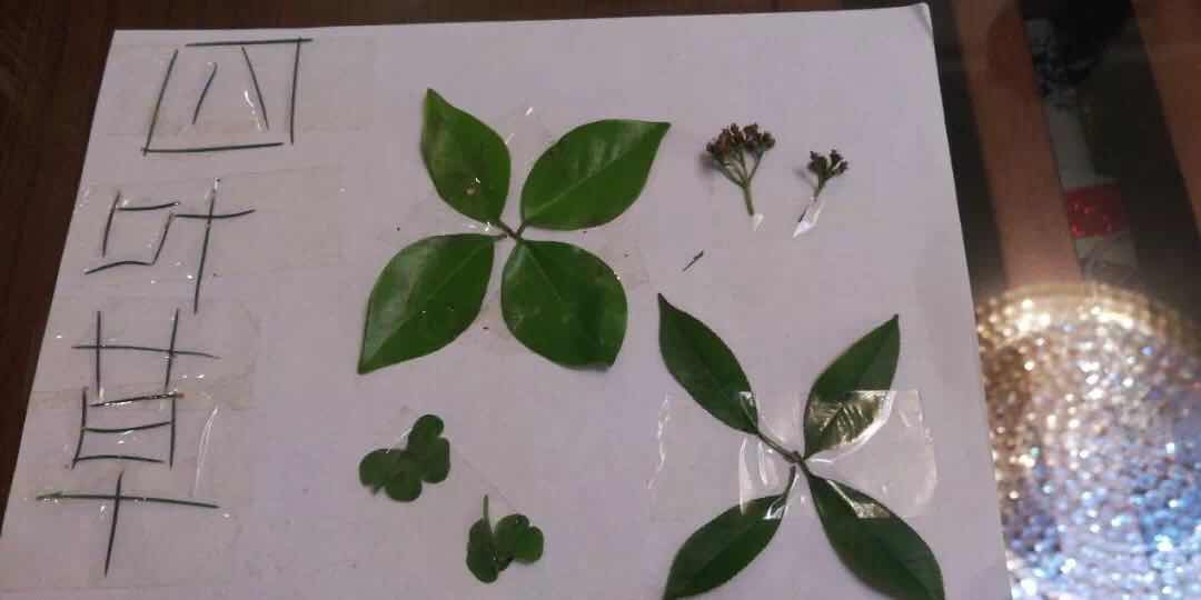 作品简介:传说中,四叶草代表着幸运,希望这幅四叶草能带给大家好运气和好心情。字体由松针组成,用树叶做了两个四叶草,附以花朵和真正的四叶草。