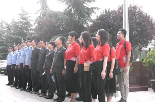普法实践团的全体成员和法院的全体参战人员统一着装在院门口集合,整装待发,实践团红色的队服和法院灰色的制服构成了一副和谐的画面。在激昂的国歌声中,执行活动的出征仪式正式拉开了序幕。