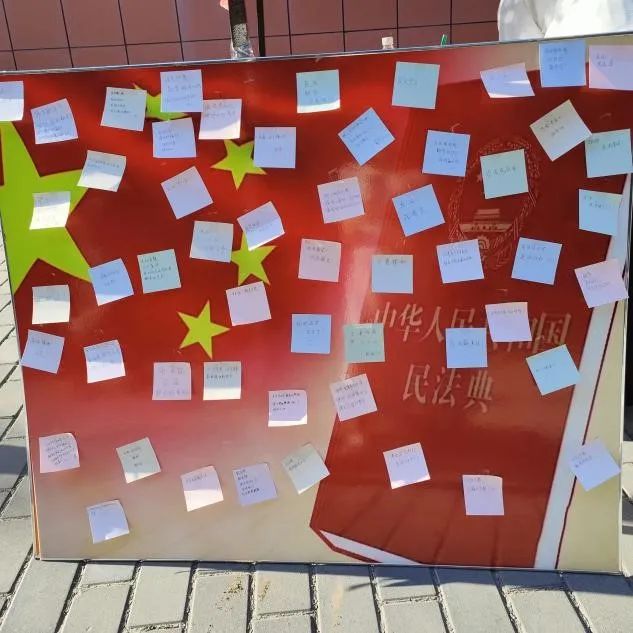 民法典是国家法律体系的重要组成部分,对于维护社会秩序、保护公民权益、促进经济发展具有重要意义。此次活动以写便利贴的形式展开,形式简单灵活,同学们积极参与,踊跃表达自己对民法典的理解和看法。在写便利贴的过程中,思考民法典与每个人生活的密切关系,面对面、零距离普法,助力“典”亮校园,真正做到让大学生潜移默化地接受法律知识的熏陶,营造良好的法治氛围,引导大学生争当新时代法治青少年,扣好人生“第一粒扣子”,“典”亮美好未来!让法律之树在大学校园茁壮生长!
