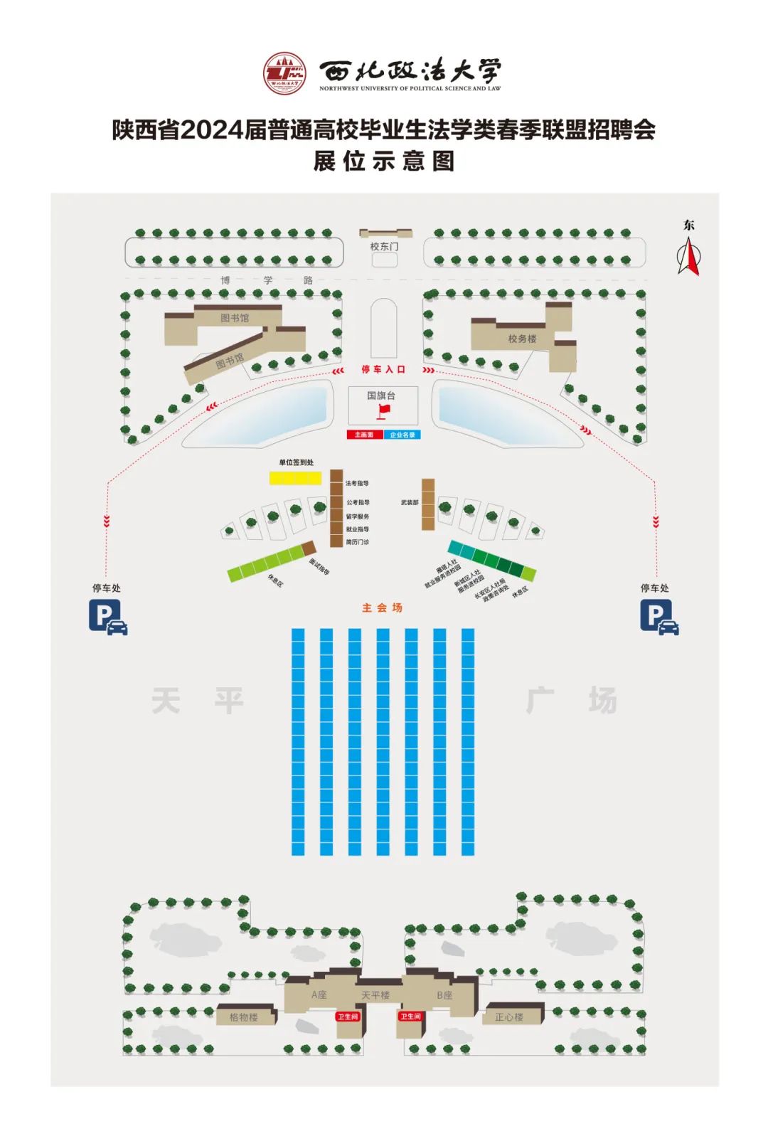 1、用人单位于9:00到达西北政法大学,由学校北二门(吉源酒店对面)进校。进校招聘车辆统一停放在会场两侧停车场。