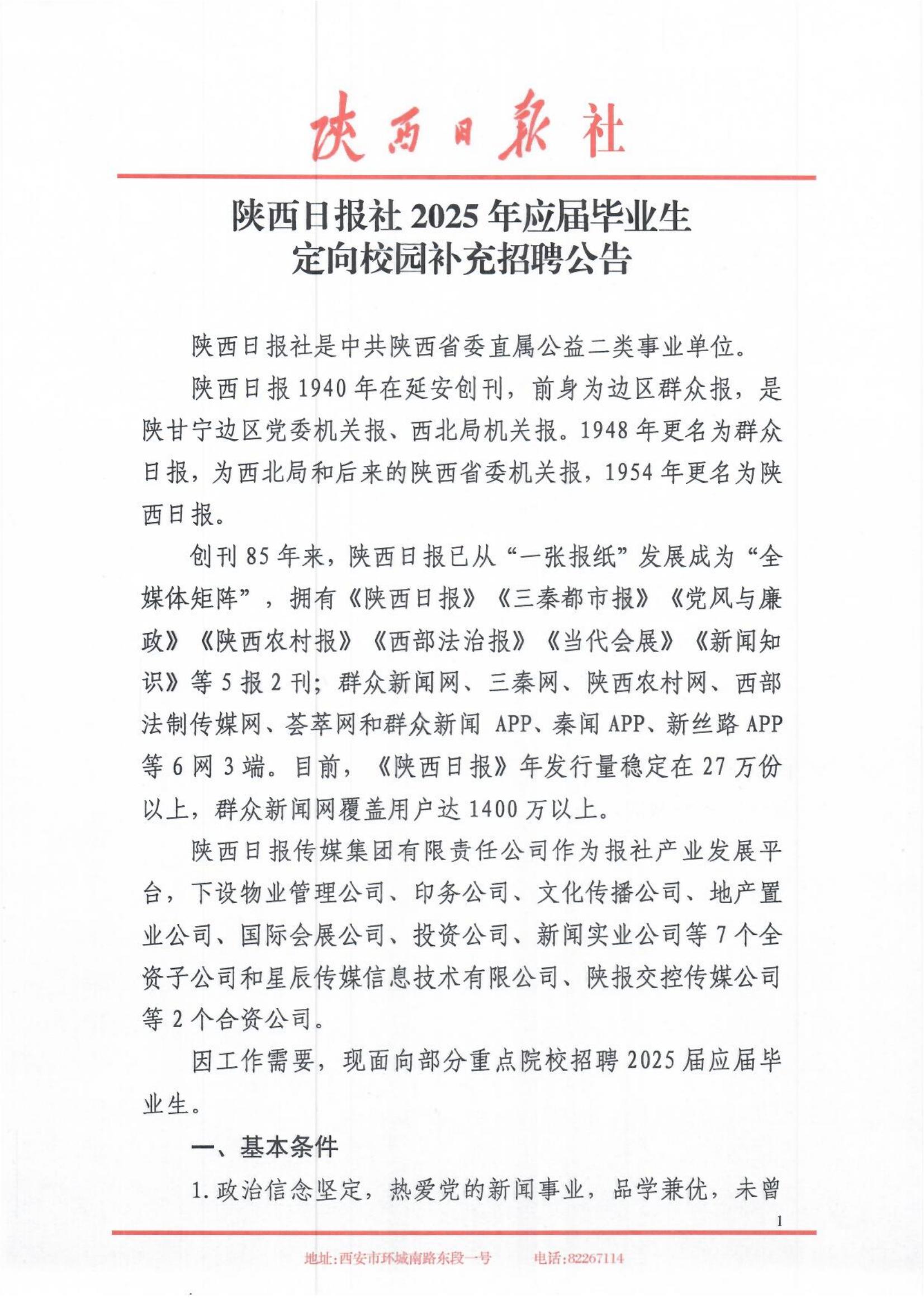 陕西日报社2025年应届毕业生定向校园补充招聘公告
