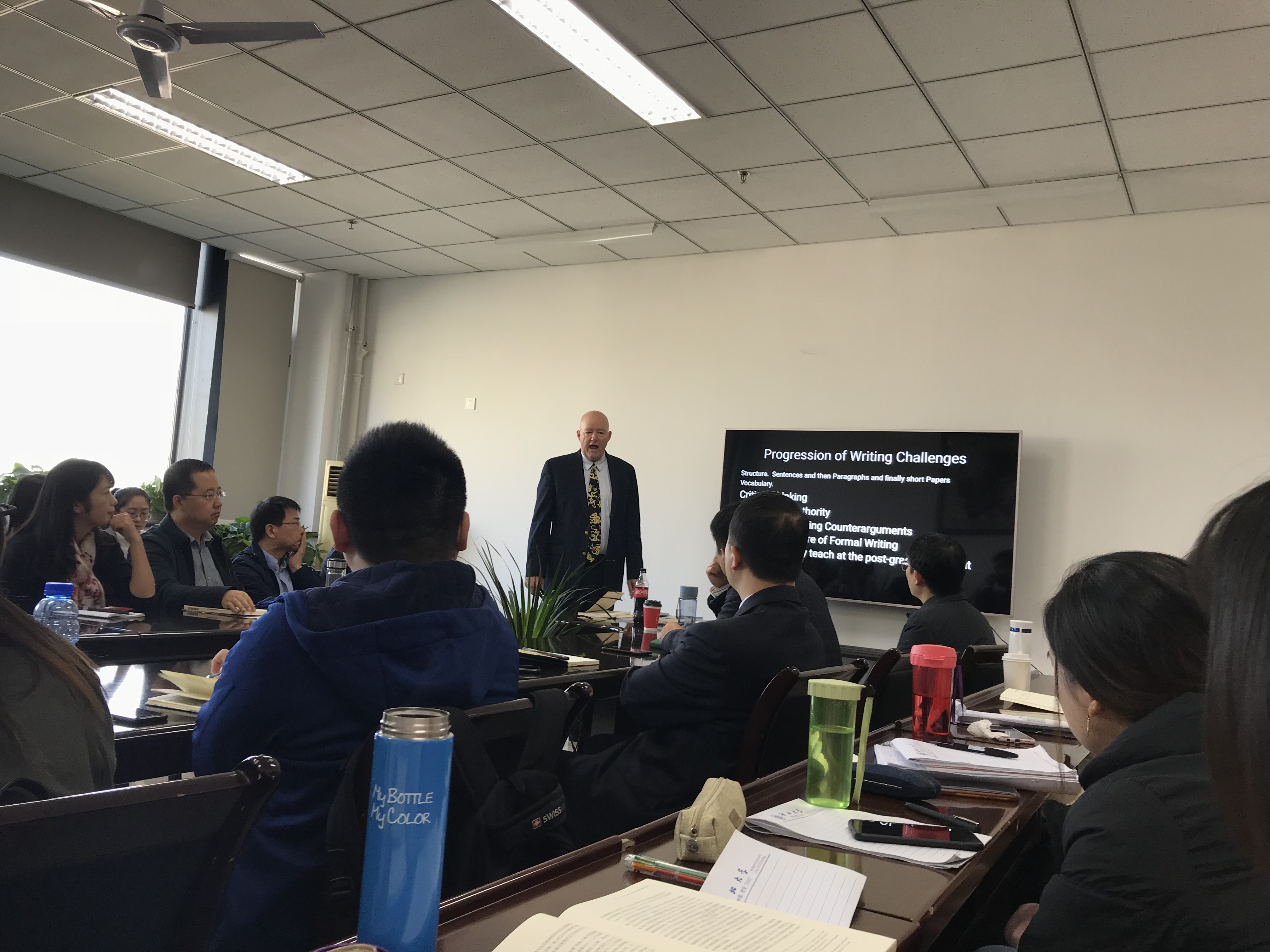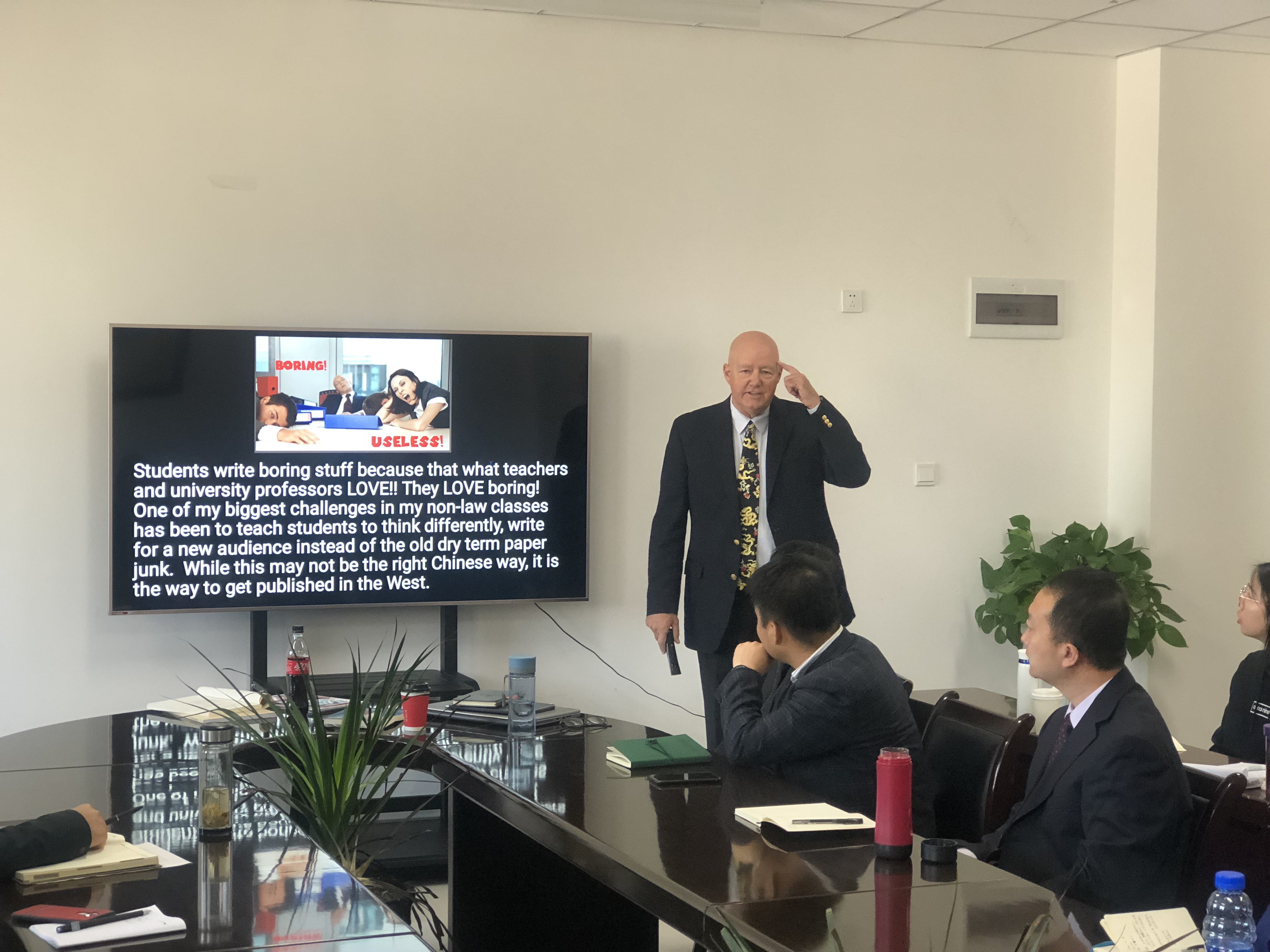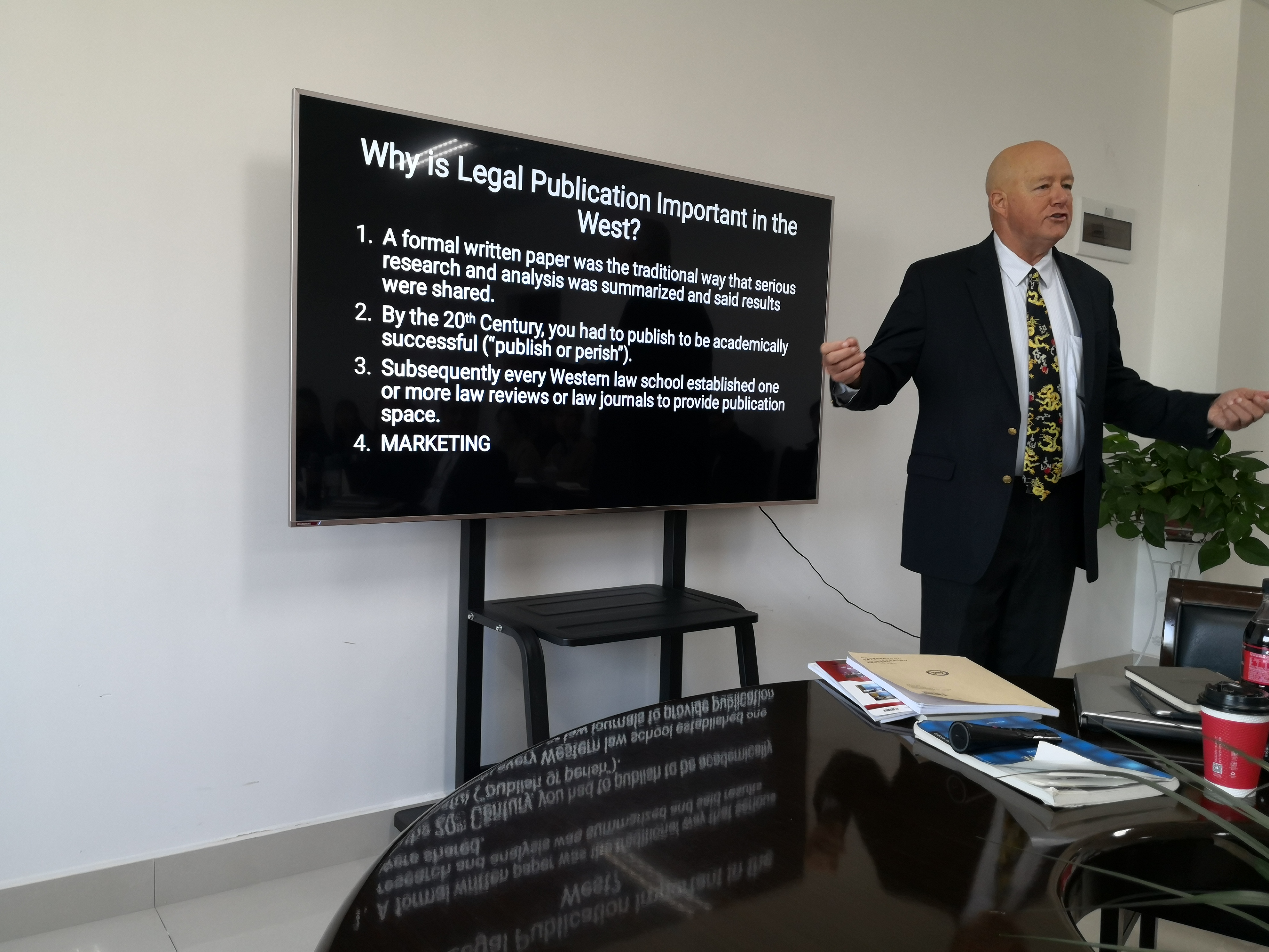 Hunt教授首先从英文学术写作的主要障碍(语言、逻辑思维习惯、表达方式等)、题目选择(什么样的题目才能吸引读者,什么样的题目会让人感觉平淡无奇)、谋篇布局、学术和引注规范(特别以Blue book为例进行说明)等多个角度向大家作以讲解。随后,Hunt教授向在场师生介绍了现有英文法学学术杂志的基本类型及主要分布国家,以及不同杂志不同的风格等问题。