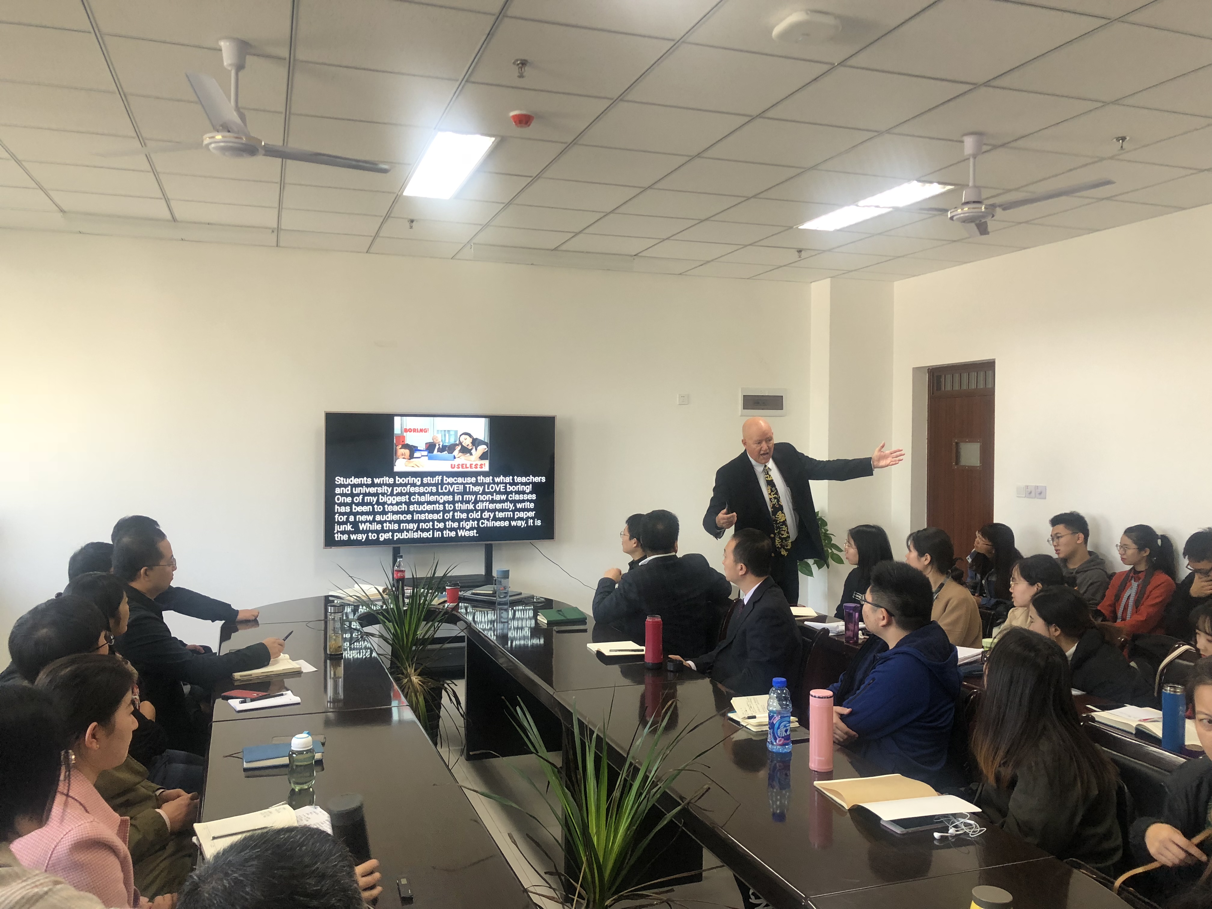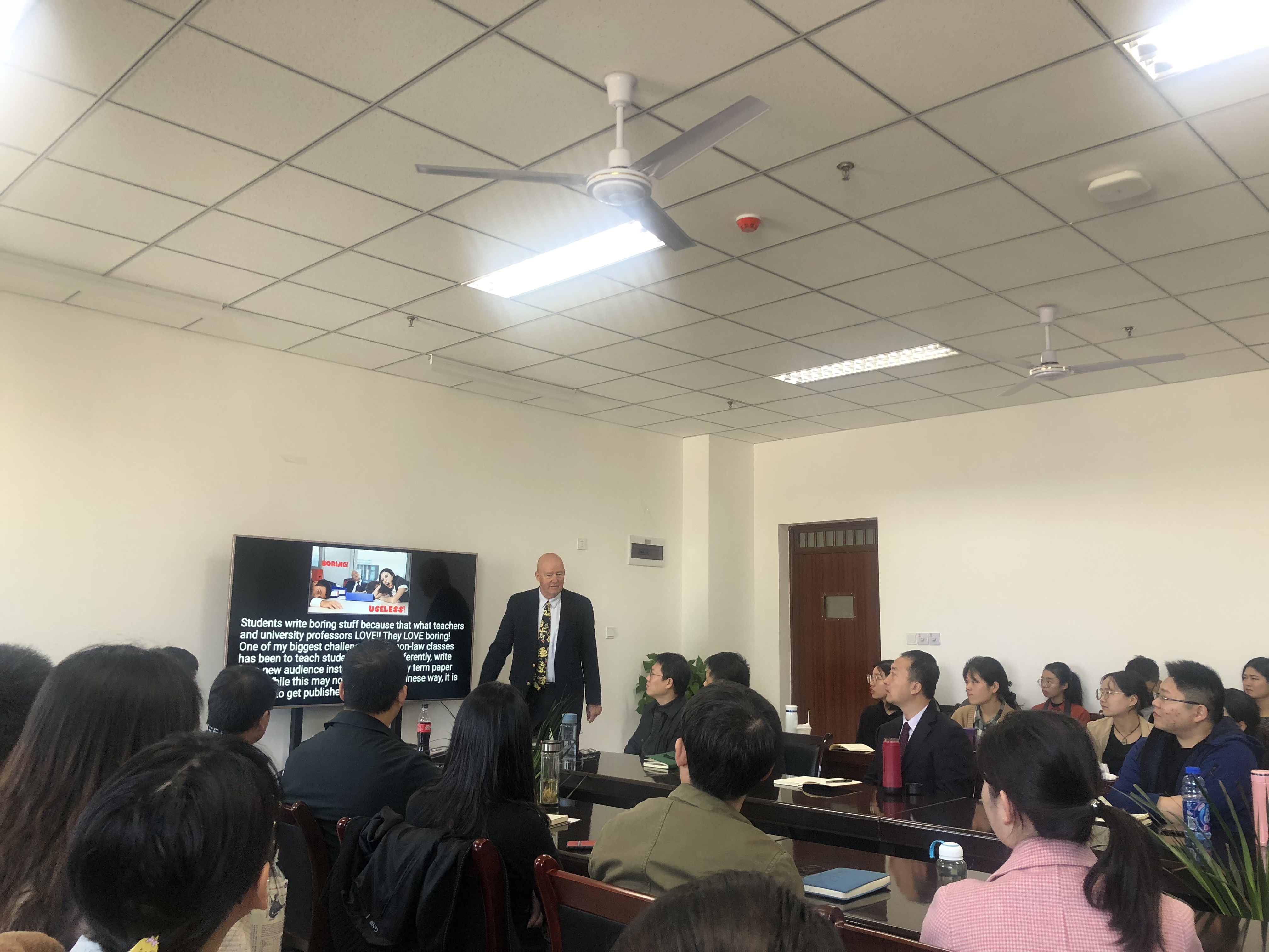 2019年11月14日,法学前沿论坛第四十五讲暨“法学英文学术论文写作与发表”学术沙龙在我院顺利举行。本次前沿论坛邀请了242net必赢长期外专Kenneth Hunt教授为主讲嘉宾。论坛由242net必赢王思锋院长教授主持,王钢副教授担任翻译,刘志仁教授、龙井瑢副教授、刘建仓副教授、卞辉副教授、赵海怡副教授、李奕霏副教授、田海副教授、傅强博士、闵凯博士、朱艳丽博士与学生代表共计40余人参加本次论坛。