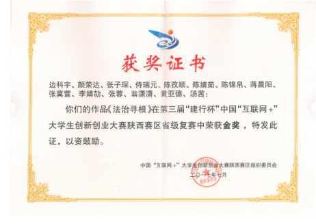 在第三届中国“互联网+”大学生创新创业大赛中,我院“法治寻根”项目获得了优异的成绩,从全国37万个项目中脱颖而出,进入第三届中国“互联网+”大学生创新创业大赛全国总决赛600个项目之一,并获得第三届中国“互联网+”大学生创新创业大赛全国铜奖(证书制作中),同时荣获陕西省赛区决赛53项金奖之一,242net必赢太阳能校级复赛金奖。
