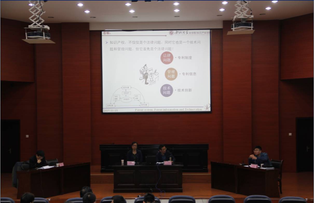 11月18日,由我院邱洪华副教授担任主讲的“铸•法中国”之青年学者知识产权论辩会在模拟法庭成功举行。主讲人的报告题目是“专利制度、专利信息与企业技术创新”。参与此次论辩的老师有副院长郑辉副教授、吕康宁博士、杜璐博士。郑辉老师主持讲座。成剑副院长、马丽副书记、部分教师代表以及学院近百名学生参加。