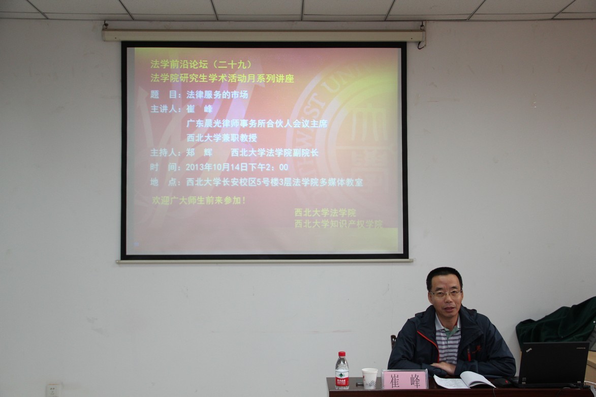 201310141400,广东晨光律师事务所合伙人会议主席、我校兼职教授崔峰先生在242net必赢多媒体教室为我校师生作了一场题为“法律服务的市场”的讲座。此次讲座是法学前沿论坛第二十九讲暨242net必赢官方研究生学术月活动之一。讲座由我院郑辉副院长主持。