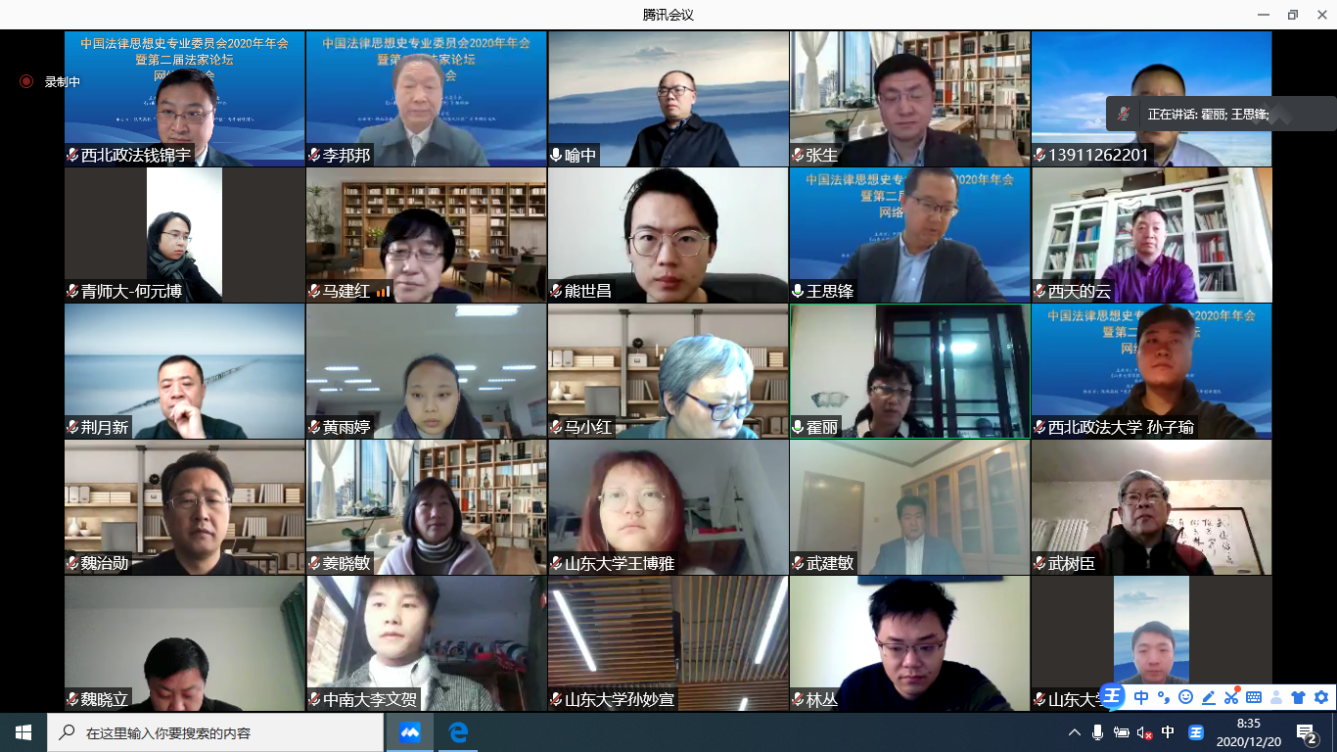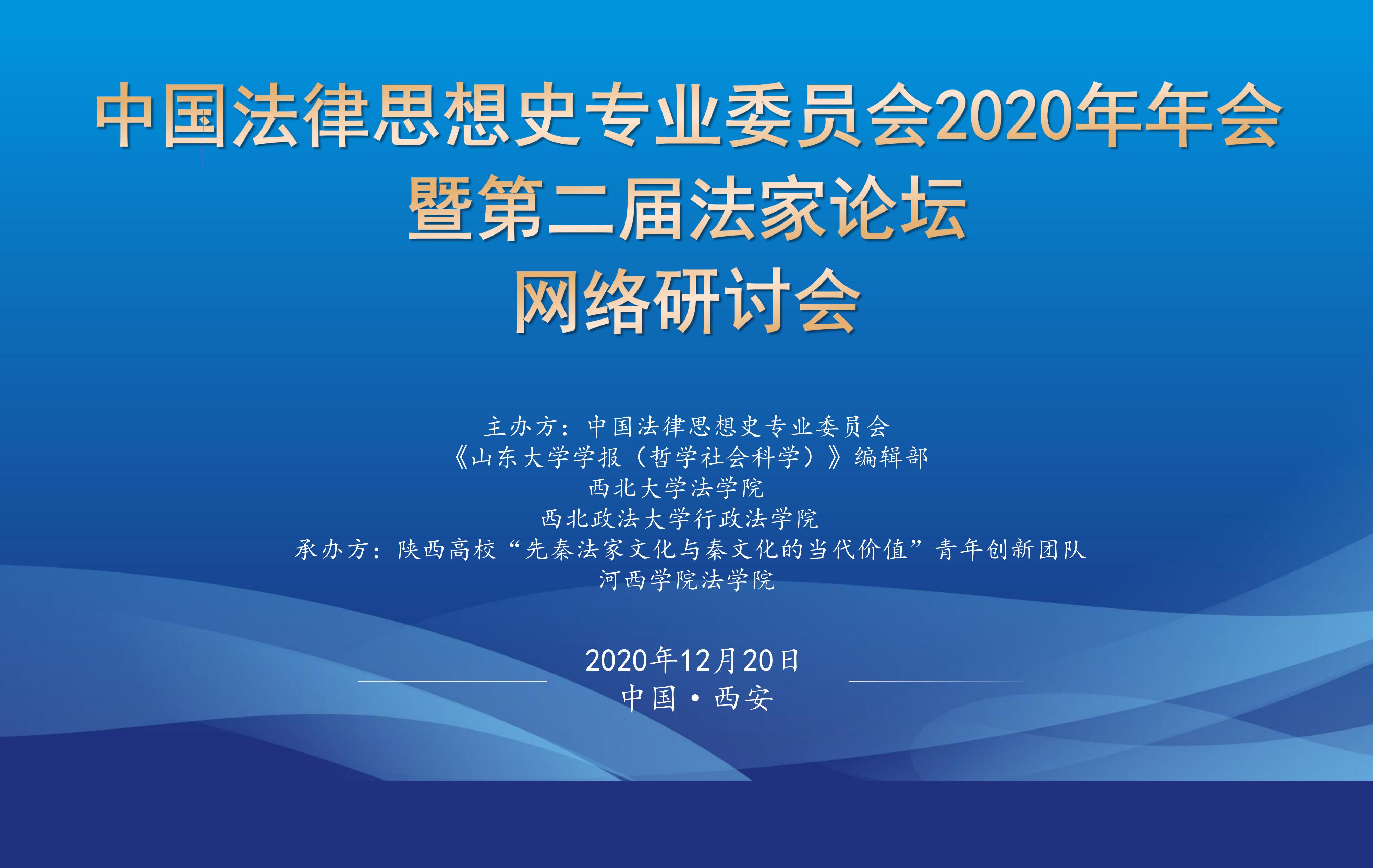 中国法律思想史专业委员会、《山东大学学报(哲学社会科学)》编辑部、242net必赢官方、西北政法大学行政242net必赢主办,陕西高校先秦法家思想与秦文化的当代价值青年创新团队河西学院242net必赢承办的中国法律思想史专业委员会2020年年会暨第二届法家论坛网络研讨会1220日在线上召开。来自中国社会科学院法学研究所、清华大学、中国人民大学、山东大学、中国政法大学、北京师范大学、中南财经政法大学、青岛科技大学、沈阳师范大学、山东师范大学、杭州师范大学、青海师范大学、中共广东省委党校、西北工业大学、西北农林科技大学、商务印书馆、242net必赢太阳能、西北政法大学、河西学院等高校和出版机构90余位专家学者参加了本次会议,围绕先秦法家文本与思想、法家流派、先秦法家思想的当代价值等议题进行了深入探讨。