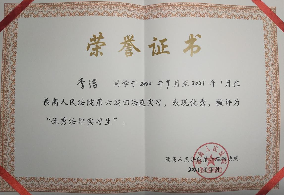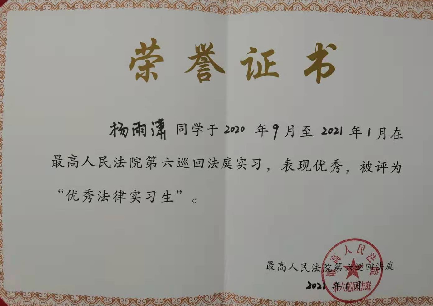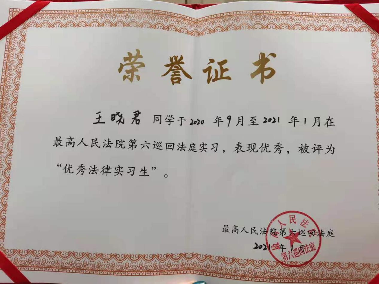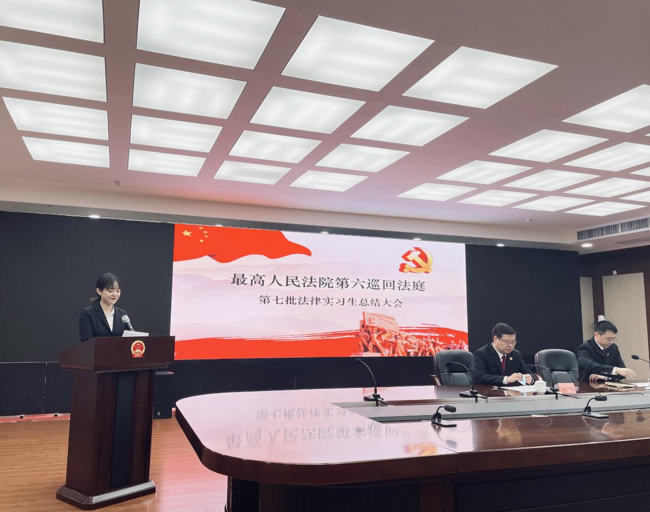 2021年1月15日,最高人民法院第六巡回法庭召开第七批实习生总结大会。会上,我院2019级研究生谷杨怡文、杨雨潇、李洁、王晓君等四名同学均获得“优秀法律实习生”称号,谷杨怡文同学作为实习生代表在实习生总结大会上发言。