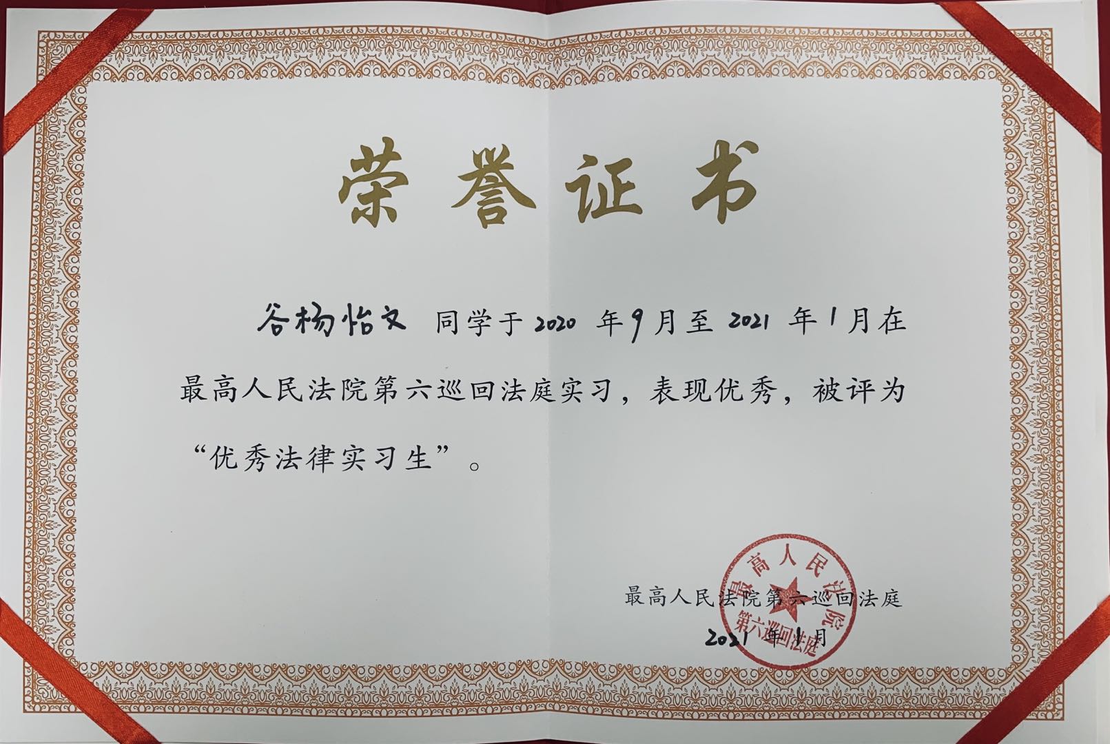 2020年9月21日至2021年1月15日共计116天的实习工作中,四名同学严格遵守实习纪律,恪守各项制度做到坚持学思悟贯通,知信行统一。工作中严格保密、谨言慎行、认真细致,坚持修身养性,严于律己,圆满完成文书校对、庭审辅助及案件审理审查报告的撰写等多项工作,谷杨怡文同学还作为本批实习生中唯一一名直接向主审法官会议汇报案件的实习生,较好地完成了一则复杂疑难案件的梳理汇报工作,四名同学在本期实习工作中均受到各自审判团队及其他团队老师的一致好评。