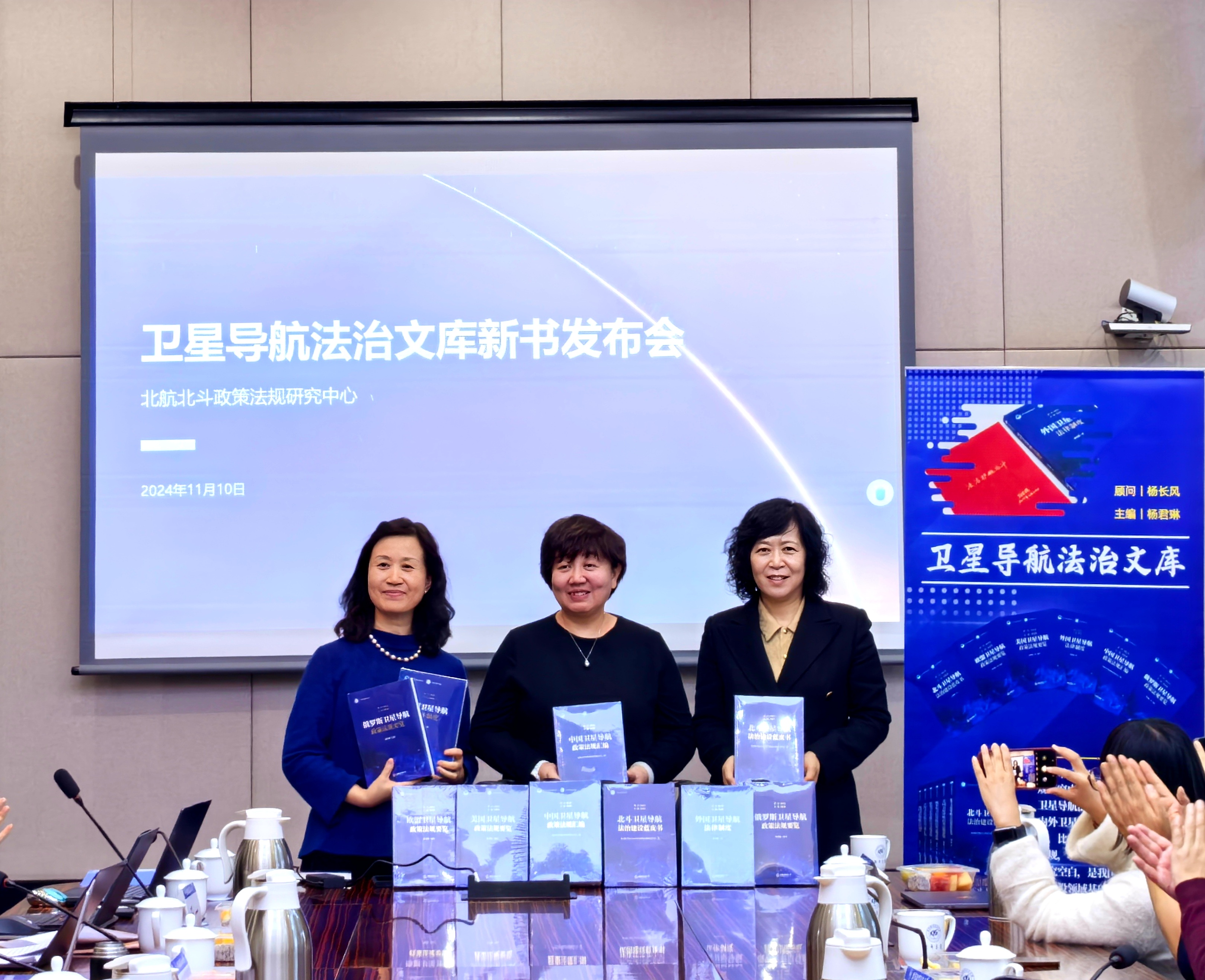 新书发布活动现场,杨君琳校友向大家分享了文库丛书的主要内容,以及文库丛书创作背后的故事。她介绍到,该文库丛书主要聚焦国内外卫星导航领域法治建设经验成果,比较分析了美俄欧卫星导航政策法规,填补了卫星导航领域法律制度研究空白,是我国首套卫星导航法治建设领域基础性、系统性、前沿性的丛书,为《中华人民共和国卫星导航条例》起草及审查工作提供了理论支撑和域外借鉴。共和国勋章”获得者、“两弹一星”功勋科学家、中国科学院院士孙家栋为文库题词,中国工程院院士、北斗系统工程总设计师杨长风担任文库总编。