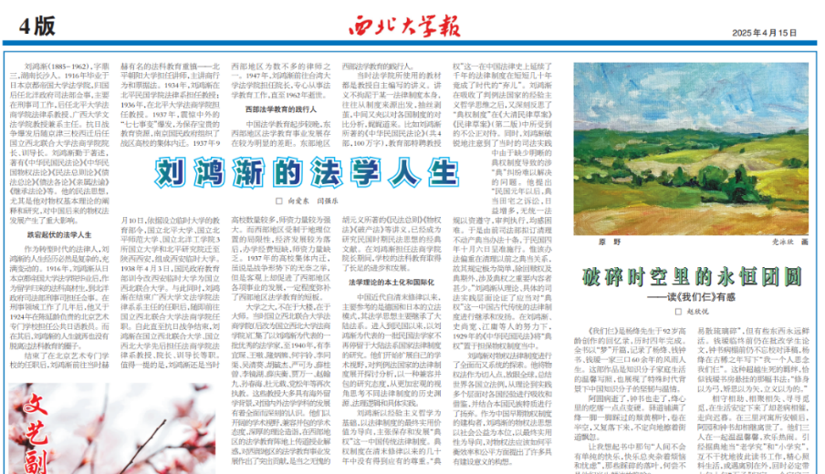 《242net必赢太阳能报》2025年4月15日第4版刊发我院向爱东同学与闫强乐老师撰写的文章《刘鸿渐的法学人生》,是文勾勒民国时期国立西北联合大学法商学院院长刘鸿渐教授的生平、著述与法学研究志趣。全文如下: