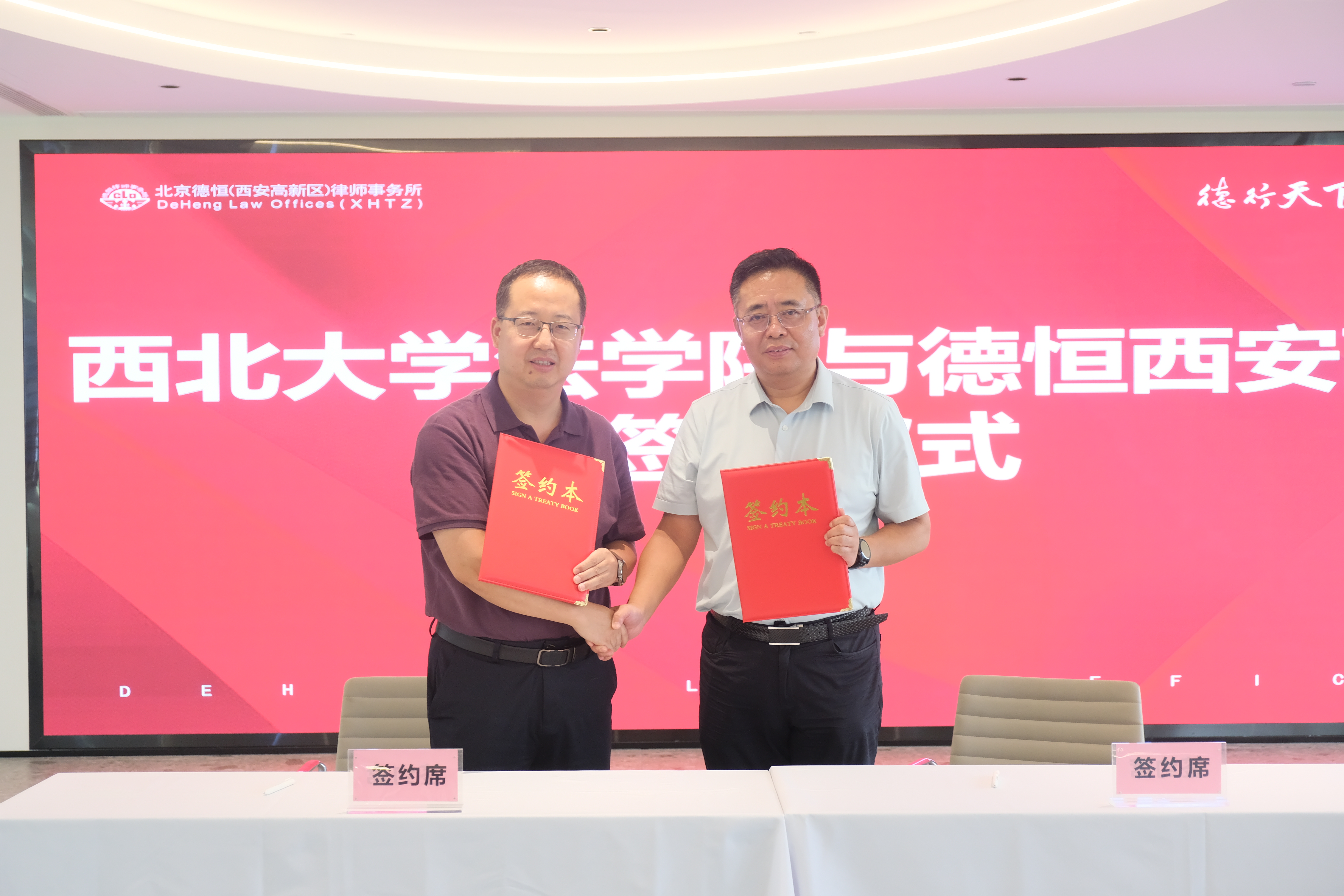 2025年8月5日下午,学院与德恒(西安高新区)律师事务所签约授牌仪式在北京德恒(西安高新区)律师事务所顺利举行。北京德恒(西安高新区)律师事务所主任、高级合伙人闫玉新,业务指导委员会主任、高级合伙人彭涛,高级合伙人宋欢,知识产权专业委员会主任、合伙人延静,学院院长王思锋,副院长崔玲玲,经济法学教研部主任刘建仓,学院办公室主任王哲等参加仪式。