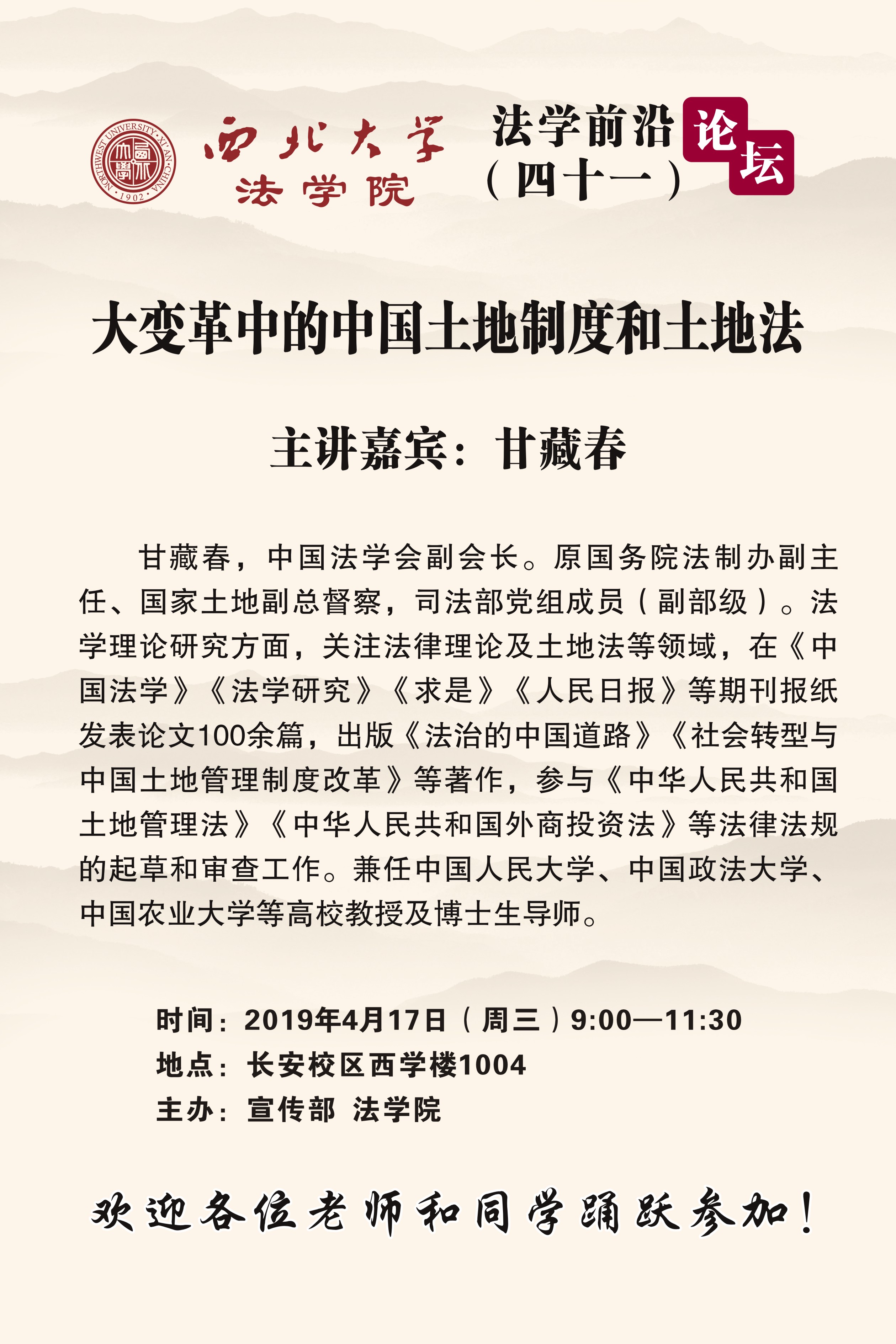 讲座通知:法学前沿论坛(四十一)“大变革中的中国土地制度和土地法”