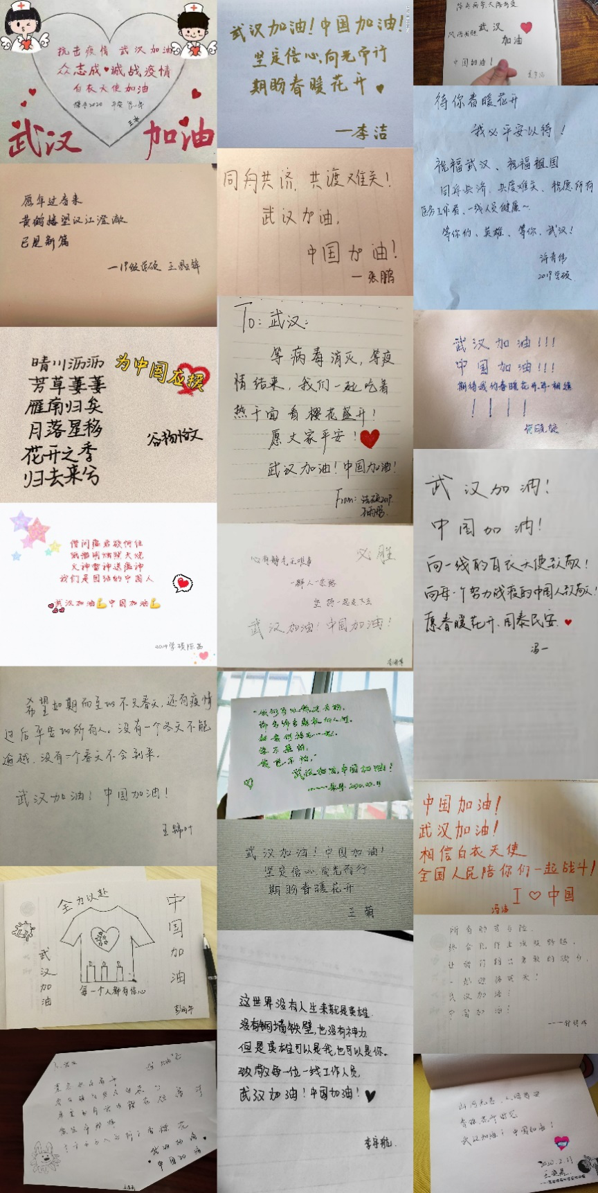 最后,同学们以卡片寄语的形式写下相互鼓励的话为武汉加油。疫情无情,人有情,我们相信,只要万众一心、众志成城,这场没有硝烟的“战疫”一定会胜利的!