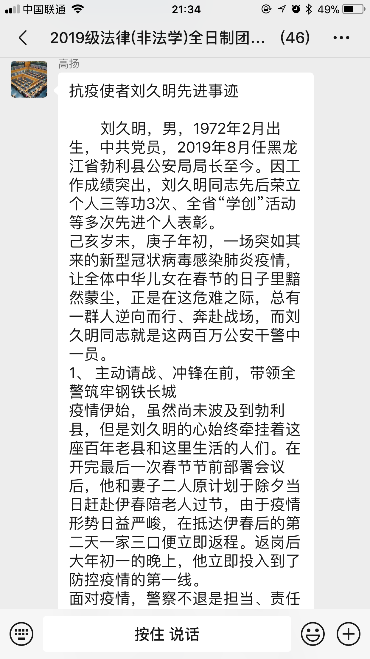 2020年2月7日,2019级法学硕士班全体同学召开了线上专题支部大会。会议由学硕支部书记王晶锌同学主持。党支部书记杨雨潇、团支部副书记许青伟首先向同学们介绍了疫情的基本情况和实时动态。