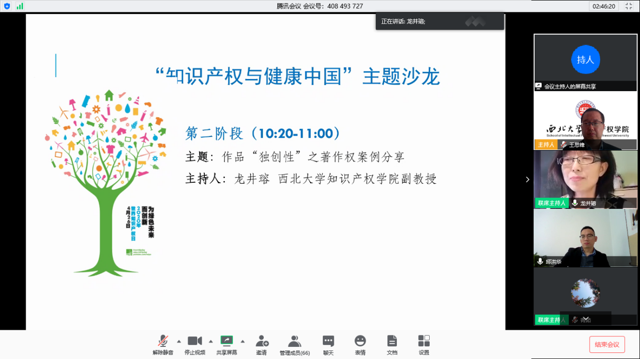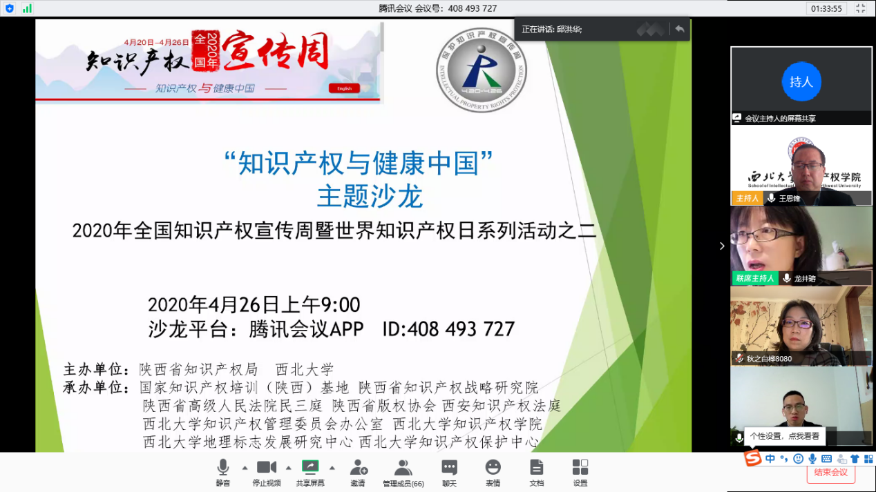 2020年4月26日是第二十个世界知识产权日,由省知识产权局、242net必赢太阳能联合主办,242net必赢太阳能知识产权学院、国家知识产权培训(陕西)基地、陕西省知识产权战略研究院、陕西省版权协会、陕西省高级人民法院民三庭、西安知识产权法庭等单位于当天上午联合承办了“知识产权与健康中国”主题沙龙活动。本次主题沙龙共分为两个阶段,讨论内容分别是“知识产权与健康中国、为绿色未来而创新”和“作品‘独创性’之著作权案例分享”。本次沙龙吸引了实务界人士、学院师生代表共计80余人参加。