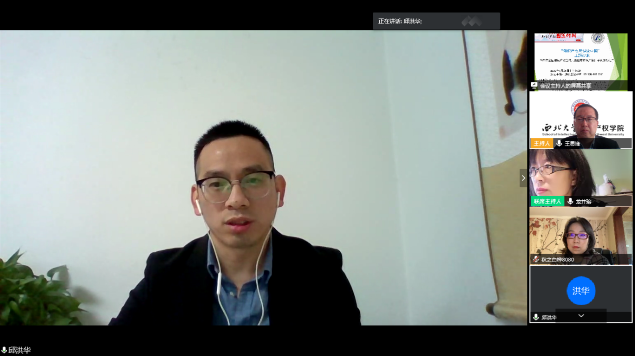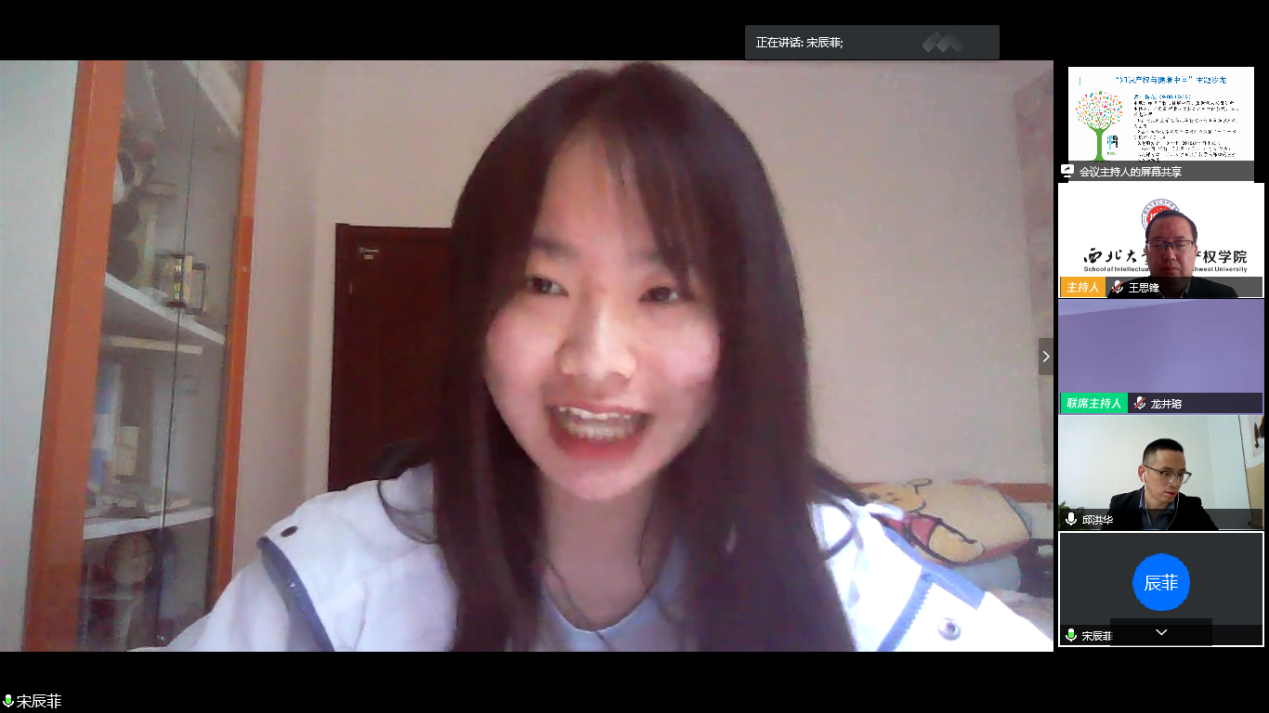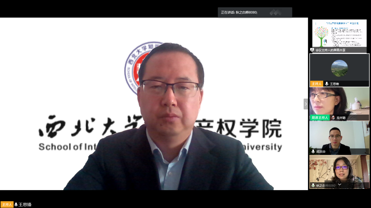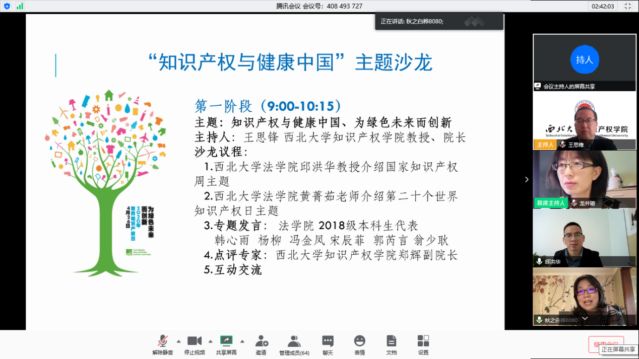 学院院长王思锋教授主持了第一阶段的讨论活动,邱洪华教授、黄菁茹老师以及我院部分学生代表就主题进行发言。邱老师介绍了国家知识产权宣传周“知识产权与健康中国”的主题,强调知识产权在当下疫情期间的重要作用。从激励新药研发、知识产权与公众利益平衡、知识产权国际合作以及知识产权保护等方面阐述了知识产权的重要地位。黄菁茹老师介绍了第二十个世界知识产权日“为绿色未来而创新”的主题,并结合知识产权的学科发展,强调了“知产人”应担负的责任感和使命感,勉励西大学子要更加努力拼搏。