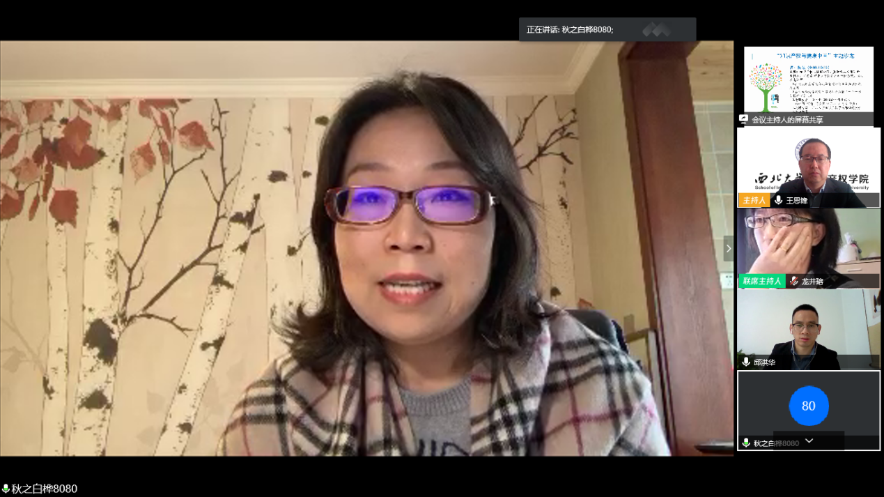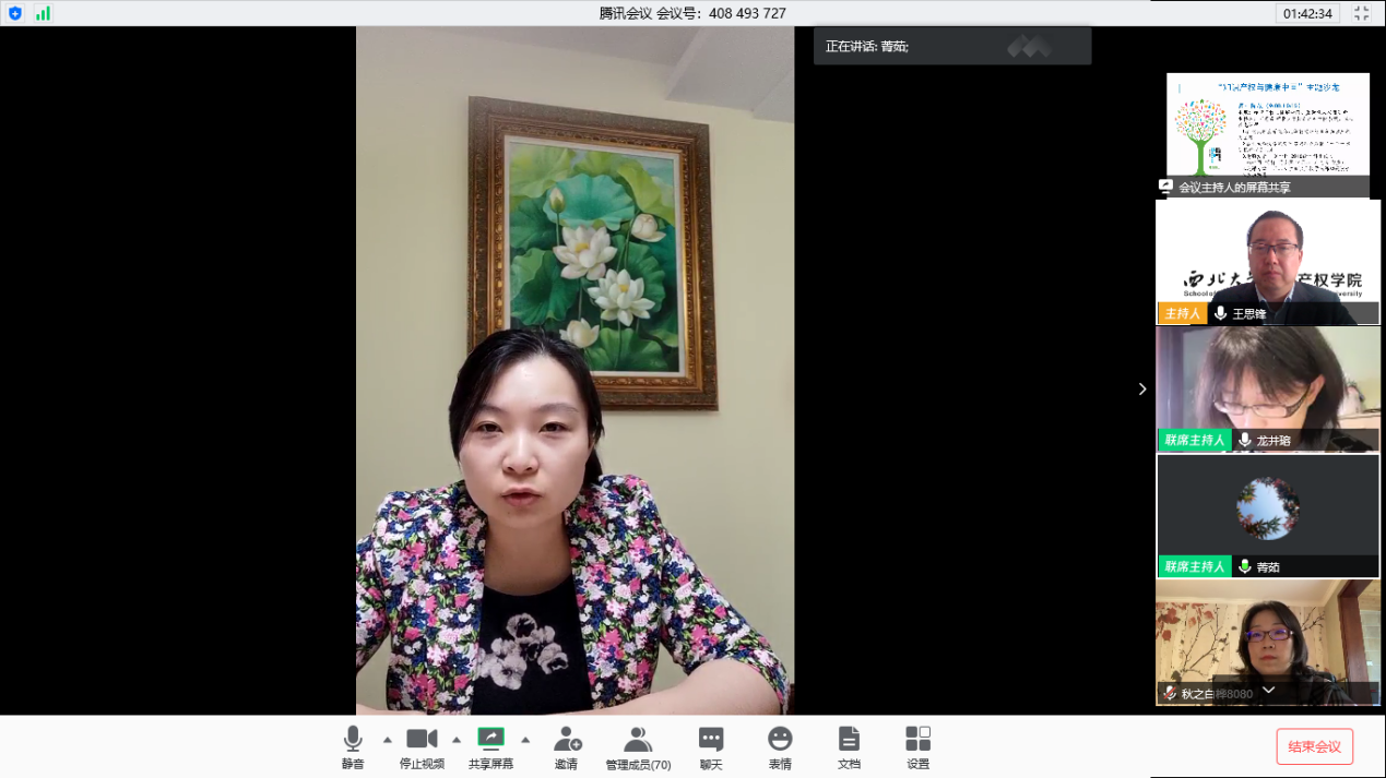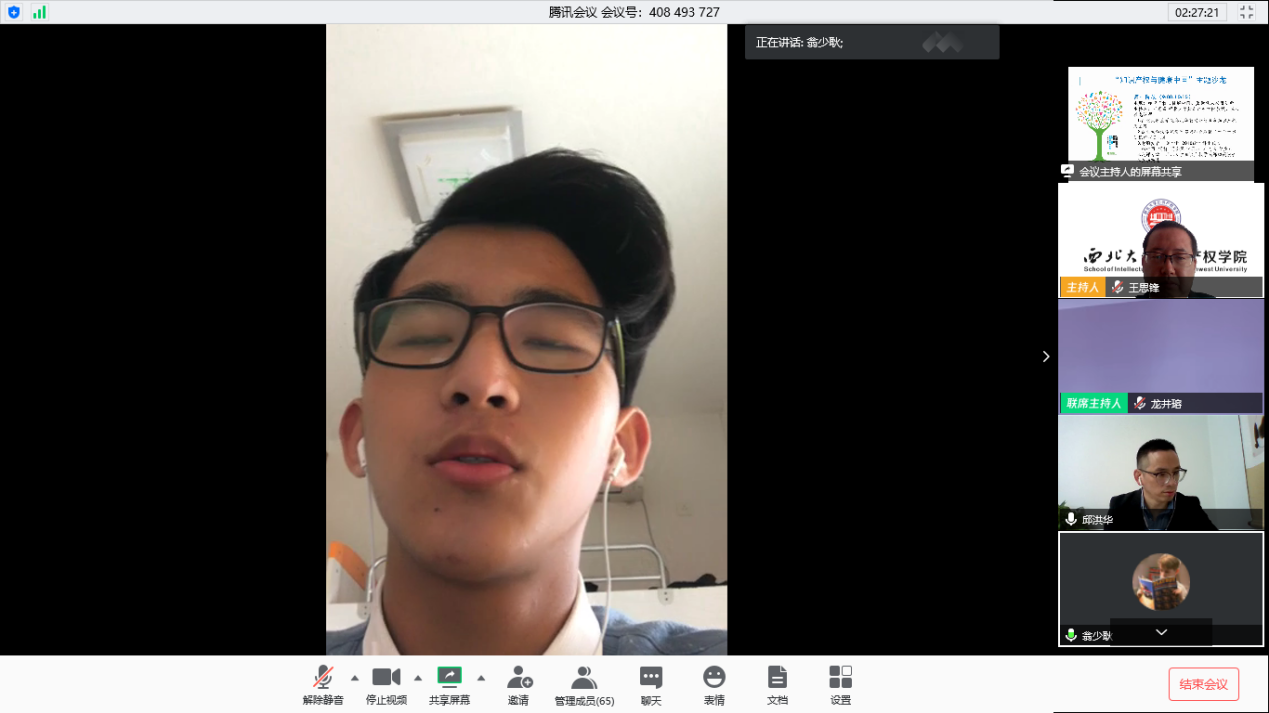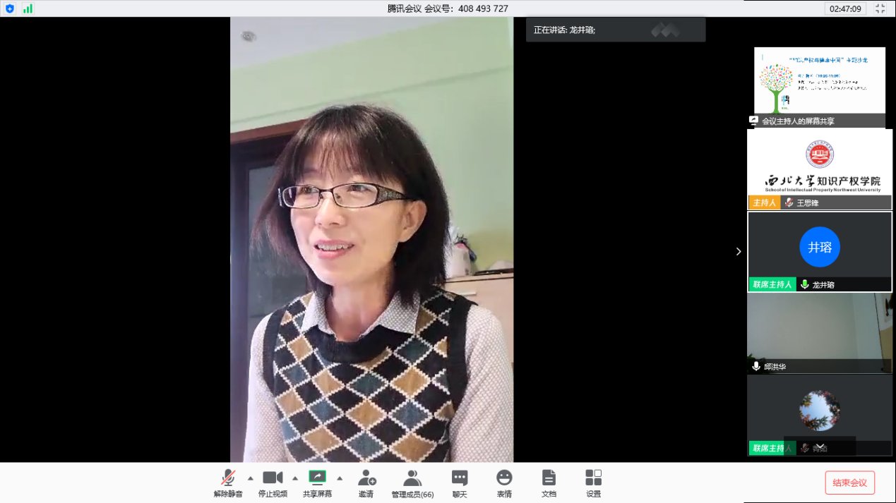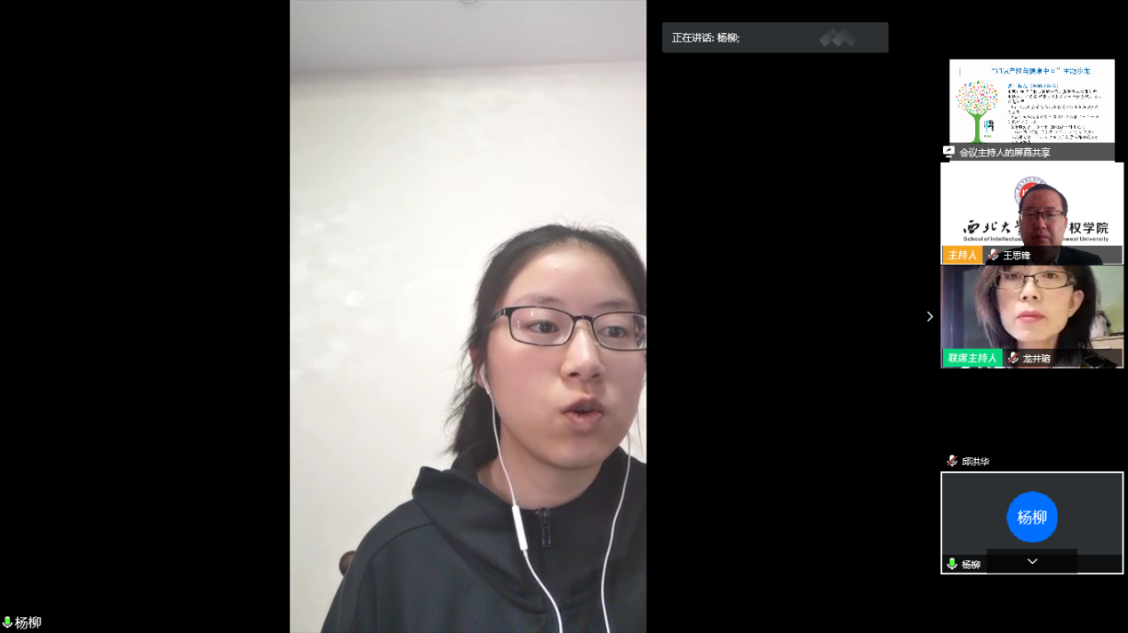 学院院长王思锋教授主持了第一阶段的讨论活动,邱洪华教授、黄菁茹老师以及我院部分学生代表就主题进行发言。邱老师介绍了国家知识产权宣传周“知识产权与健康中国”的主题,强调知识产权在当下疫情期间的重要作用。从激励新药研发、知识产权与公众利益平衡、知识产权国际合作以及知识产权保护等方面阐述了知识产权的重要地位。黄菁茹老师介绍了第二十个世界知识产权日“为绿色未来而创新”的主题,并结合知识产权的学科发展,强调了“知产人”应担负的责任感和使命感,勉励西大学子要更加努力拼搏。