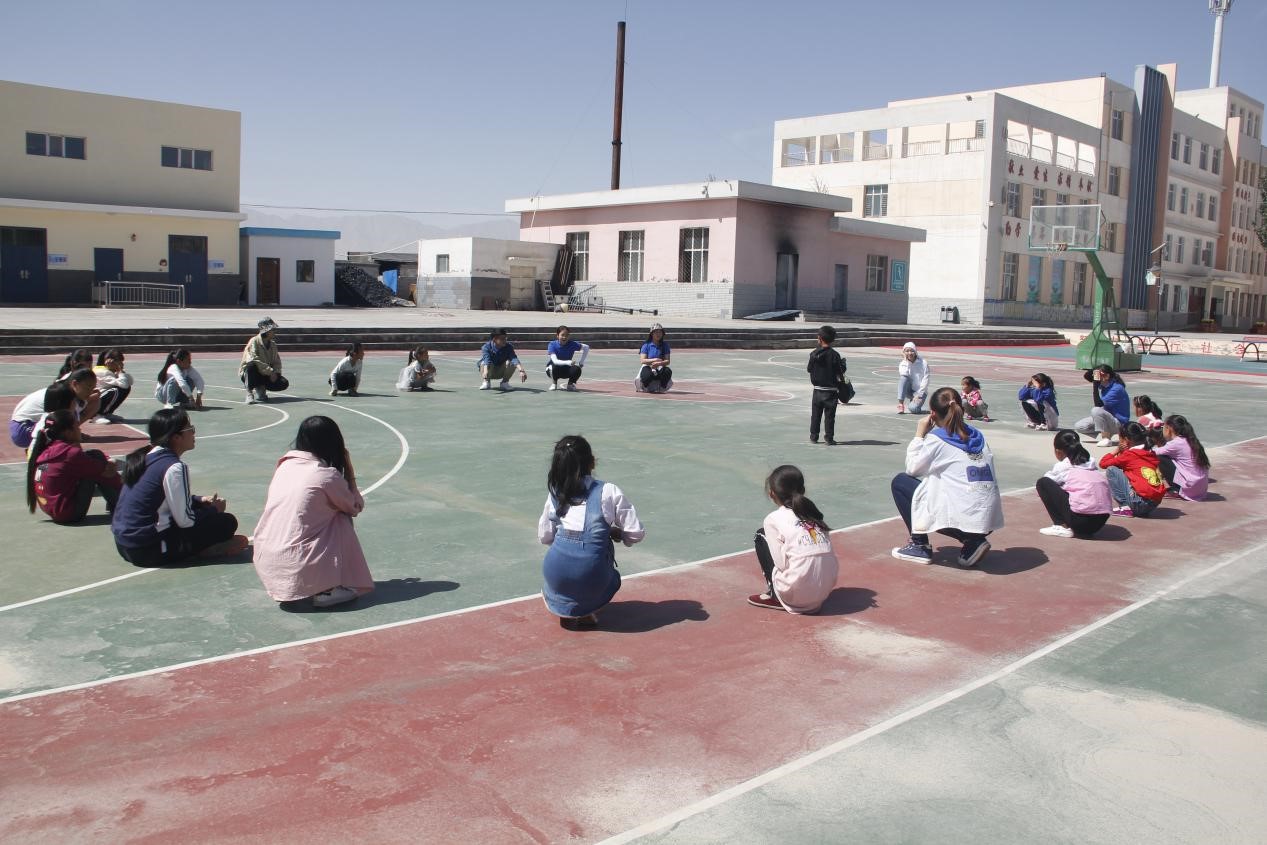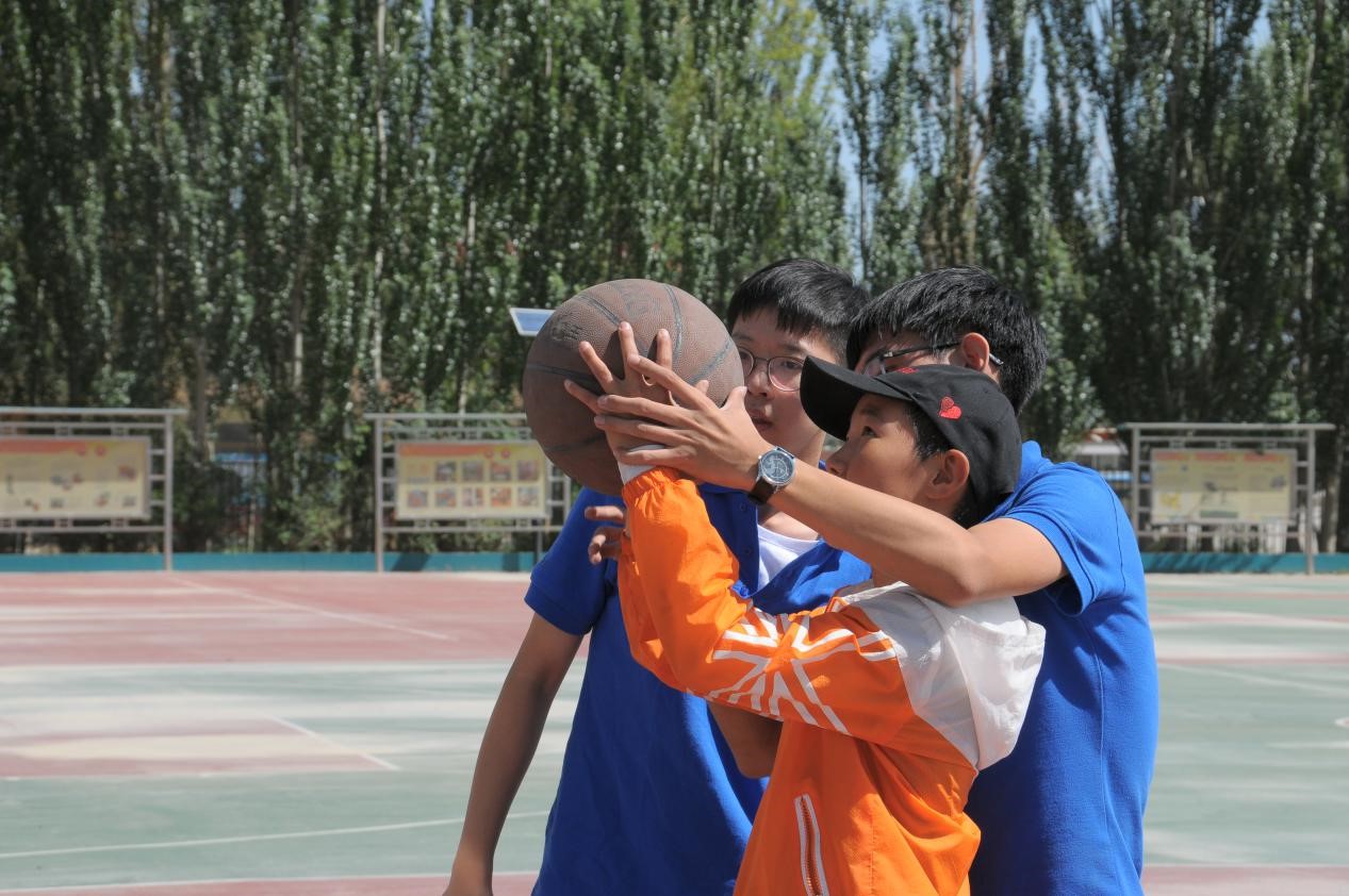 体育课上,孩子们按年龄段被分为了两组。一部分在几个老师的带领下练习投篮,另一部分则和老师们一起玩老鹰抓小鸡以及丢手绢的趣味游戏。孩子们欢乐的笑脸衬的格尔木的天空更蓝了。  undefined undefined