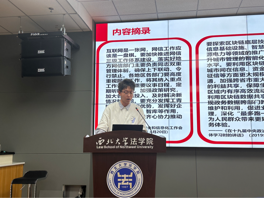2022级法学硕士班刘庚鑫同学分享《习近平关于网络强国论述摘编》,刘庚鑫同学首先介绍了本书的出版背景和主要内容,这本书摘录了习近平总书记围绕网络强国建设发表的一系列重要论述、提出的一系列新思想新观点新论断,全书分为九个专题,共计285段论述。其次简要介绍了各个专题内的论述内容。最后分享了自己的阅读感悟,他认为,网络社会更加需要加强依法治理,用法律规范予以约束和引导,一方面要加快相关法律法规的设立与落实,维护网络空间中良性有序的社会运转;另一方面要加强网络法律法规的宣传,提升网络法治意识。
