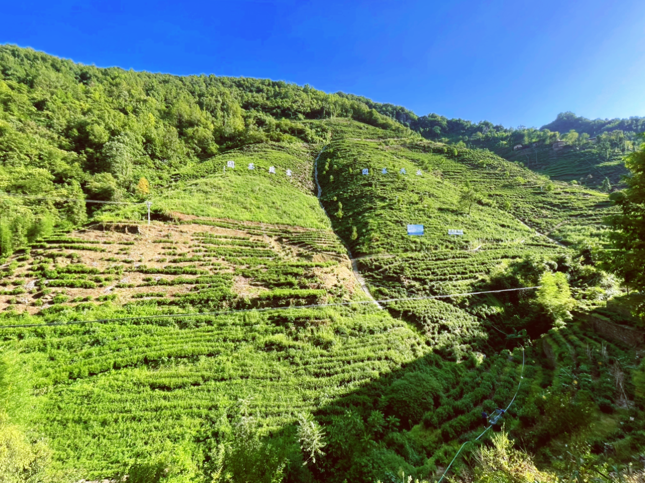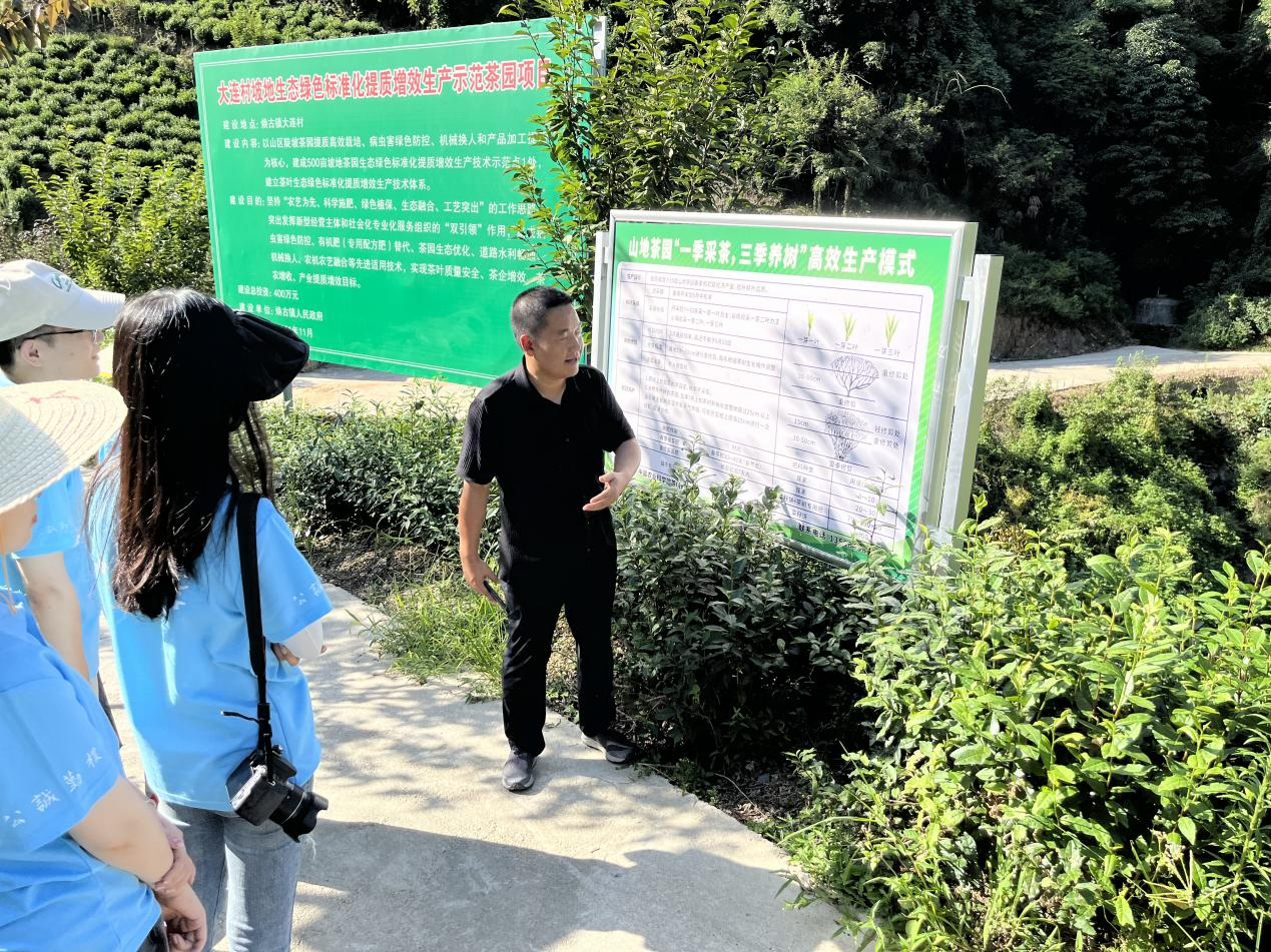 紧接着,实践调研团的老师和同学们前往紫阳县大连村示范茶园参观。大连村示范茶园坚持“农艺为先、科学施肥、绿色植保、生态融合、工艺突出”的工作思路,与中国农业科学院茶叶研究所开展合作,通过山地轻简化机械作业、病虫害绿色防控、优质茶标准化加工提质等核心技术,探索出“一季采茶,三季养树”的高效生产模式。通过实地考察,实践调研团对茶叶生产中鲜叶采摘、茶树修剪、树冠养护、茶树施肥等种植知识有了深入了解。在茶园参观结束后,调研团成员认为茶叶种植过程中要增质提效,必须充分利用本地土壤富硒的自然条件,积极与科研单位展开合作,以技术创新为手段,以知识产权为保障,更好利用当地地理标志,才能真正做到因茶兴业,因茶致富。