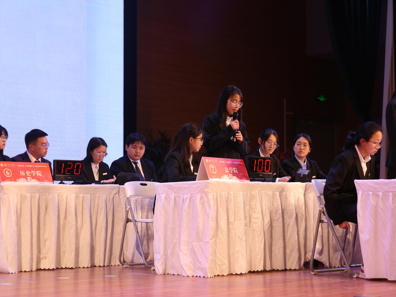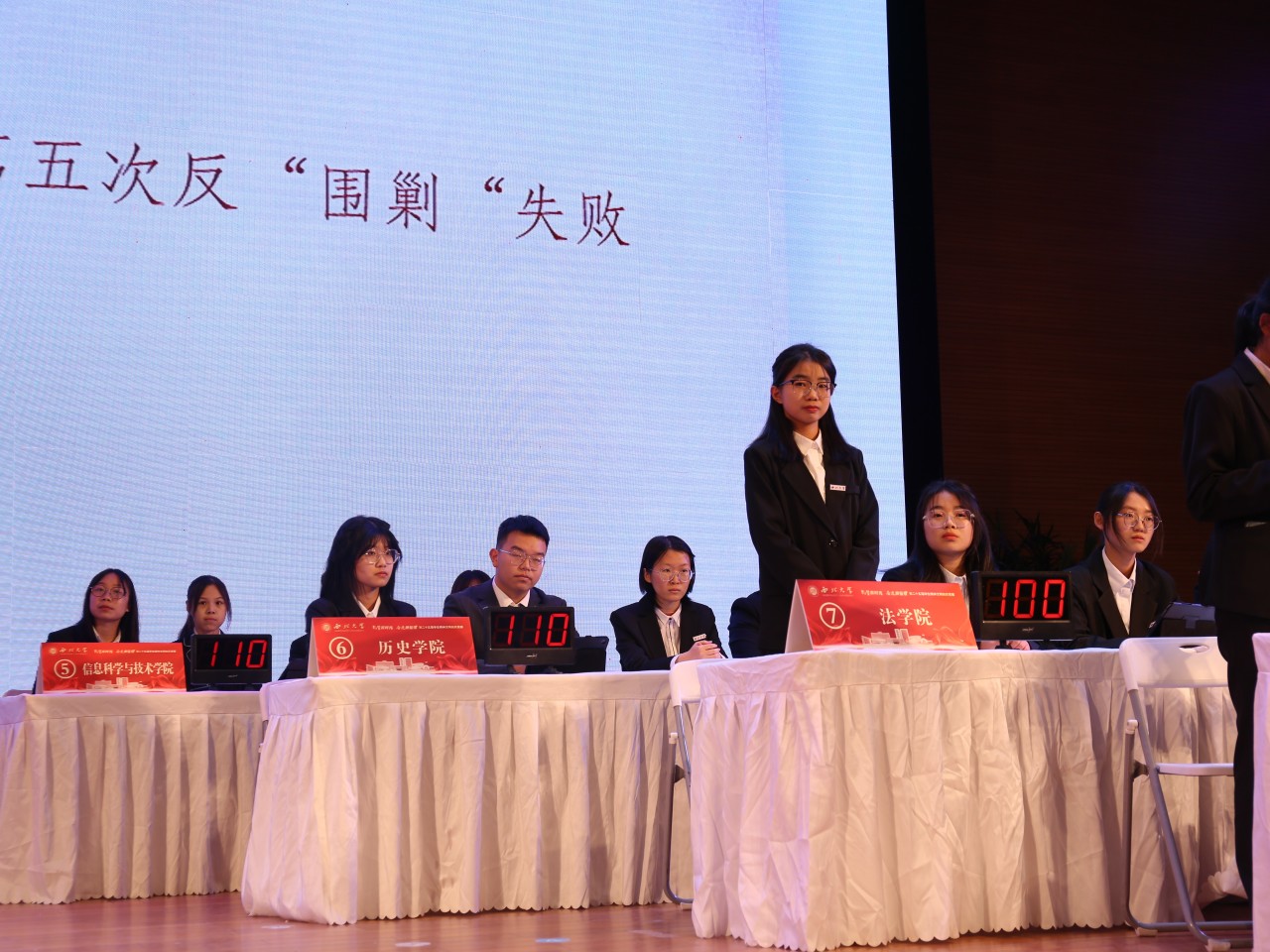 首先是必答题环节,每队的四位成员依次分别作答有关四史、习近平新时代中国特色社会主义思想、校情校史、校纪校规方面的问题。我院选手在此环节中取得了110分的好成绩。接下来是抢答题环节,此环节中我院选手奋起直追,大胆果断抢答,认真细致作答,最终获得了150分的成绩,暂列第一。紧接着是视频分析题环节,我院选手们思路清晰、默契配合、结合实际、流利作答,赢得了25分的好成绩。最后是风险题环节,我院选手谨慎地选择了20分的题目。
