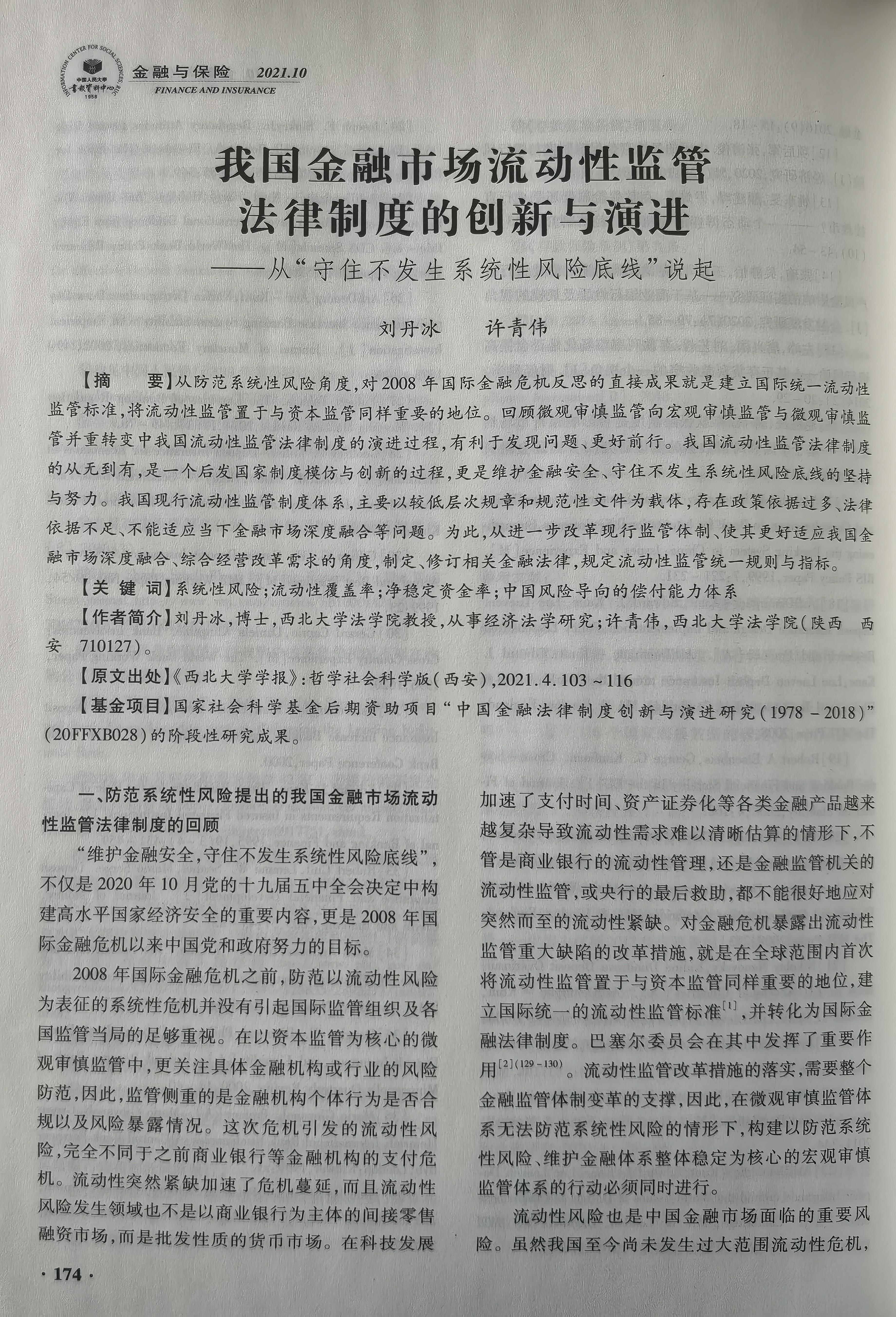 我院刘丹冰教授撰写的论文《我国金融市场流动性监管法律制度的创新与演进》被《人大复印资料·金融与保险》2021年第10期“金融法苑”栏目全文转载,该论文原发表于《242net必赢太阳能学报(哲学社会科学版)》2021年第4期;撰写的论文《我国中央银行流动性工具箱的创新、演进特点及法律问题研究》被《人大复印资料·金融与保险》2022年第5期“金融法苑”栏目全文转载,该论文原发表于《242net必赢太阳能学报(哲学社会科学版)》2022年第1期。