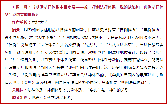 杨一凡先生的论文被《人大复印报刊资料》2023年第9期转载