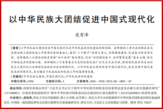 近日,学院虎有泽教授的论文“以中华民族大团结促进中国式现代化”在CSSCI期刊《西南民族大学学报》》(人文社会科学版)2024年第6期发表。文章认为中华民族大团结促进中国式现代化是中华民族共同体建设的新思路。该命题的三重内在逻辑是在完成新征程上党的民族工作重要任务的基础上,落实“三个赋予”的重大意义,实现强国建设、民族复兴的宏伟目标。该命题的三大理论功能是坚持“四个共同”基本理念,突出“共同团结奋斗、共同繁荣发展”基本主题,坚定不移地走共同富裕之路。该命题的三个重要着力点是促进各民族广泛交往交流交融,推动各民族共同走向社会主义现代化以及推进民族地区社会治理现代化。 以中华民族大团结促进中国式现代化,就是实现中国式各民族共同现代化,其关键在于民族地区和民族工作的高质量发展。