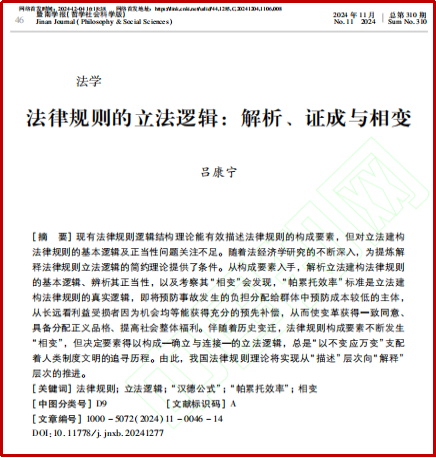 近日,学院教师吕康宁博士的论文“法律规则的立法逻辑:解析、证成与相变”在CSSCI来源期刊《暨南学报(哲学社会科学版)》2024年第11期发表。