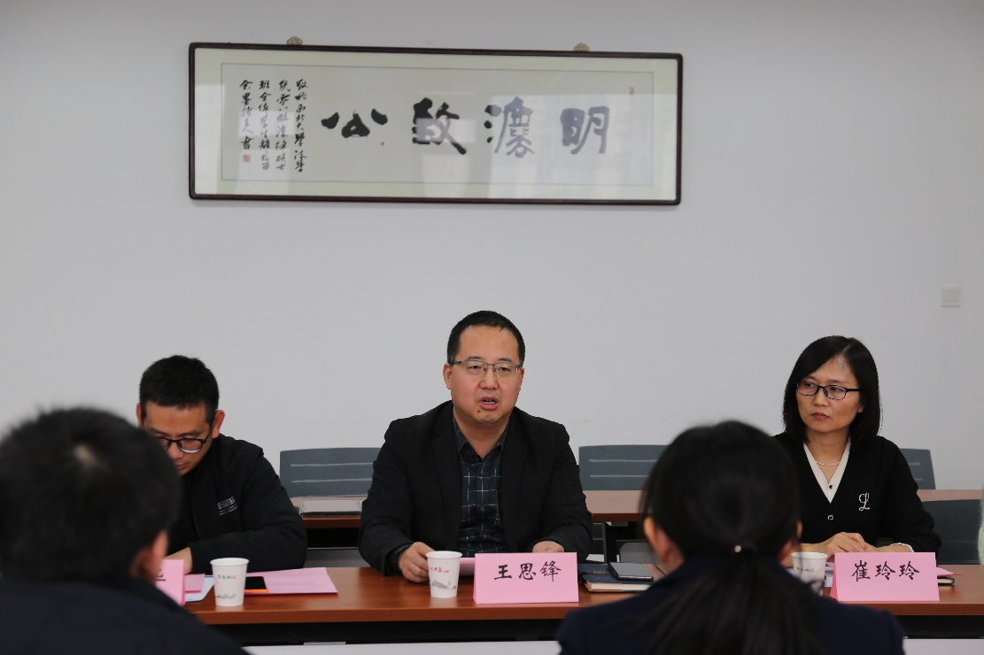 王思锋院长首先对史丽妮副院长一行五人莅临我院交流工作表示欢迎。随后,他介绍了院的发展历史、师资力量、人才培养制度、学科建设、科学研究以及特色研究方向等情况尤其详细介绍了我院知识产权专业的建设情况。他提到,目前我院正在不断推进法学教育模式和法治人才培养机制改革,积极与实务部门深入合作,探索协同育人机制,通过课程共建、专业共建、师资共建、队伍共建实现校地融合发展提升人才培养质量最后,王思锋院长对史丽妮副院长一行莅临我院交流工作再次表示感谢,并希望双方今后在法治人才培养、实践教学以及重点在知识产权保护等领域加强合作,立足新需求、迎接新挑战,共同推进法学理论与实践的融合发展。
