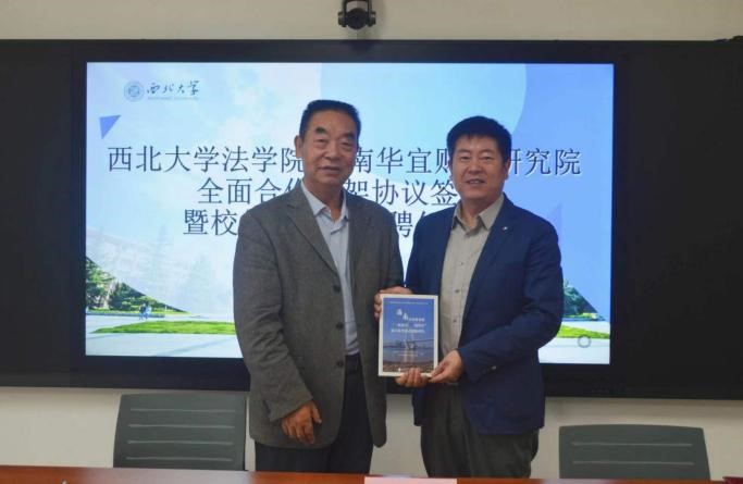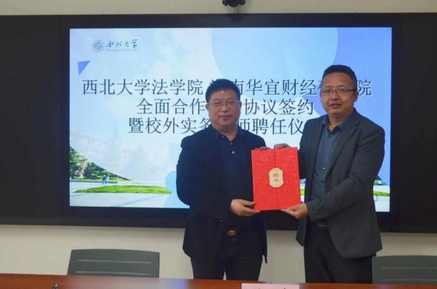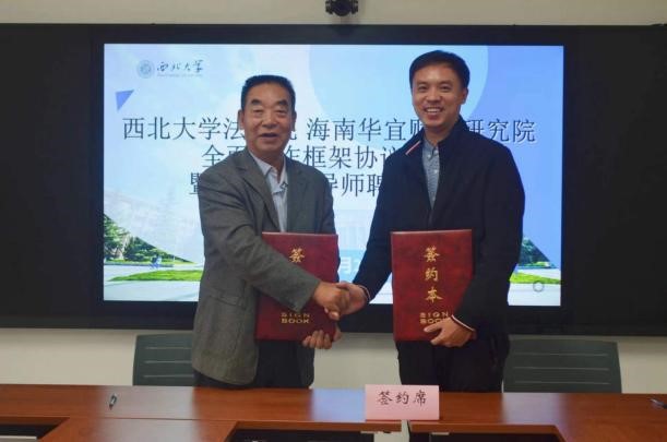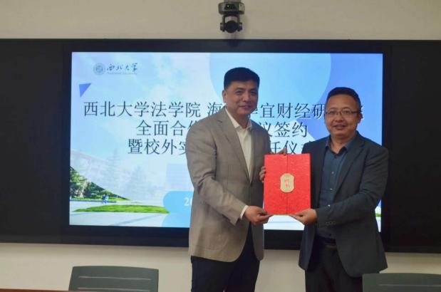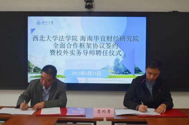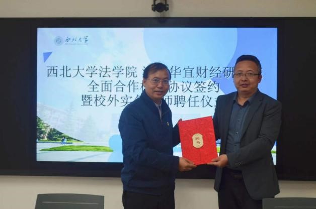 4月21日上午十点,我院与海南华宜财经研究院全面合作框架协议签约暨硕士研究生实务导师聘任仪式在西学楼北0906会议室顺利举行。中国财税法研究会副会长、海南华宜财经研究院顾问贾绍华,国家税务总局宝鸡市税务局副局长姚鑑,国家税务总局西安市税务局科研所副所长杨溪,国家税务总局西安市灞桥区税务局总会计师张国防,以及学院党委书记李一凡、副书记丁晓雯,副院长代水平、崔玲玲、许博,学校“一带一路”税法研究中心主任、学院教授王鸿貌,经济法学教研部侯欢参加此次签约仪式。